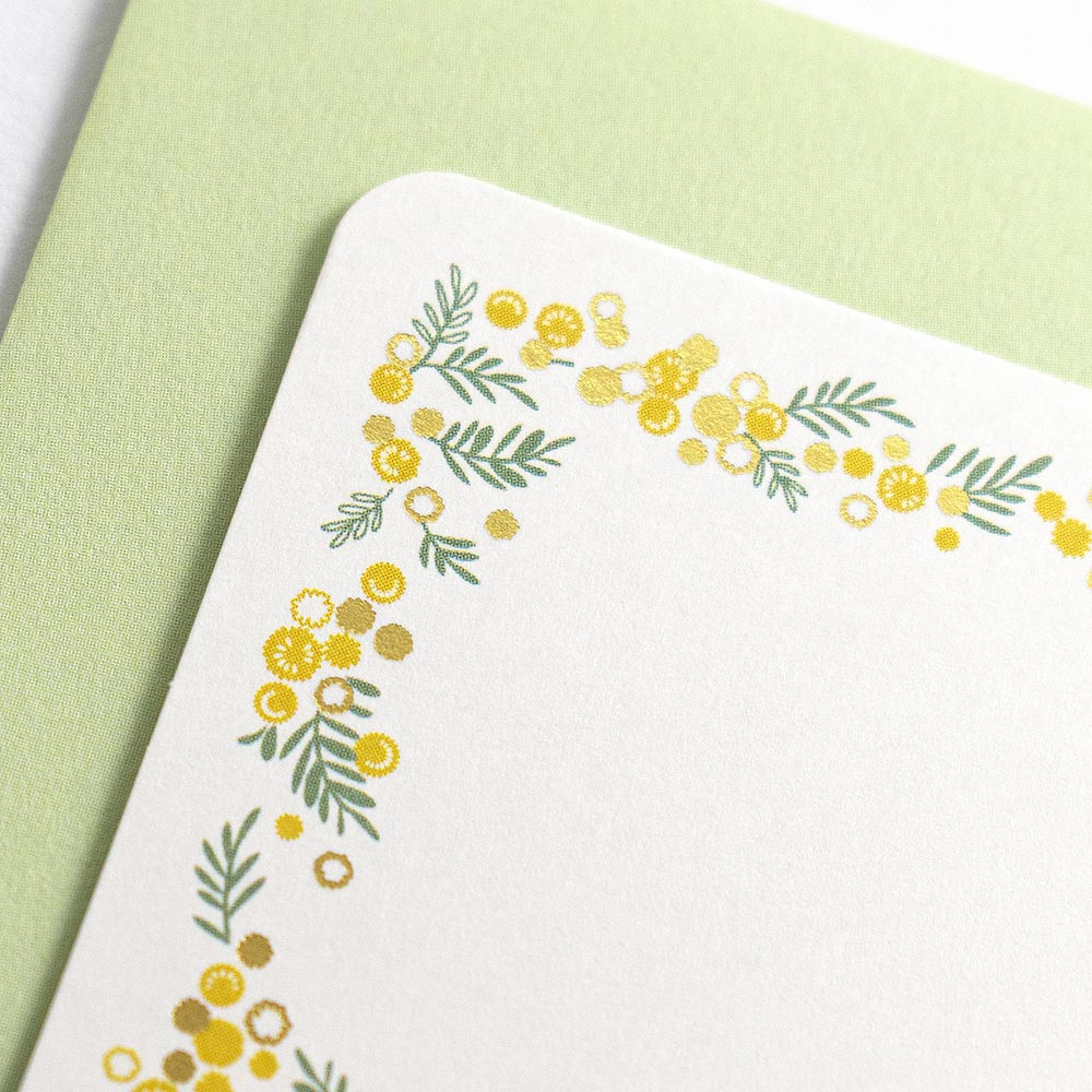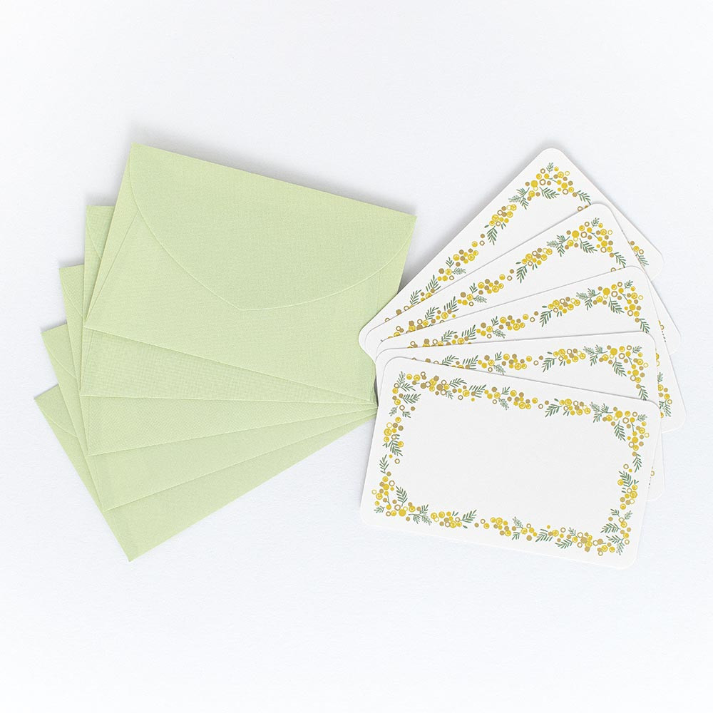 繊細な金箔押し加工を施した封筒付きのメッセージカードです。 黄色いミモザが明るく、可愛いデザインです。