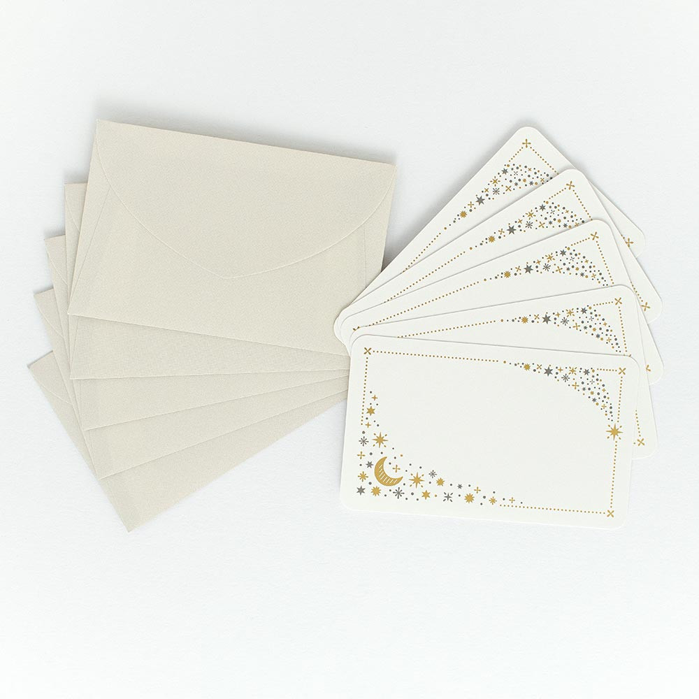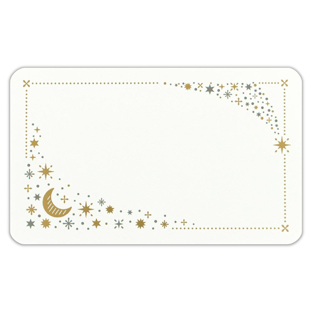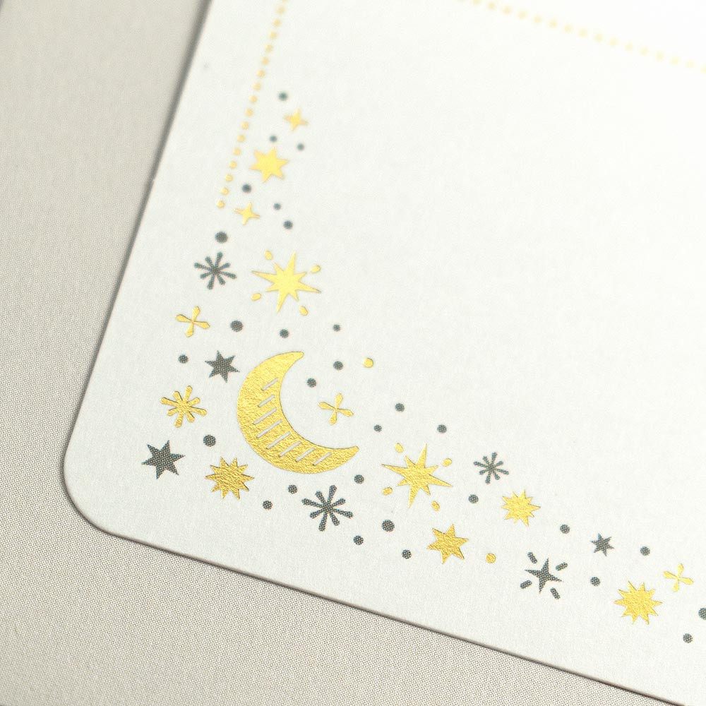 繊細な金箔押し加工を施した封筒付きのメッセージカードです。 落ち着いた色合いで瞬く星々、月、流れ星を描いたデザインです。