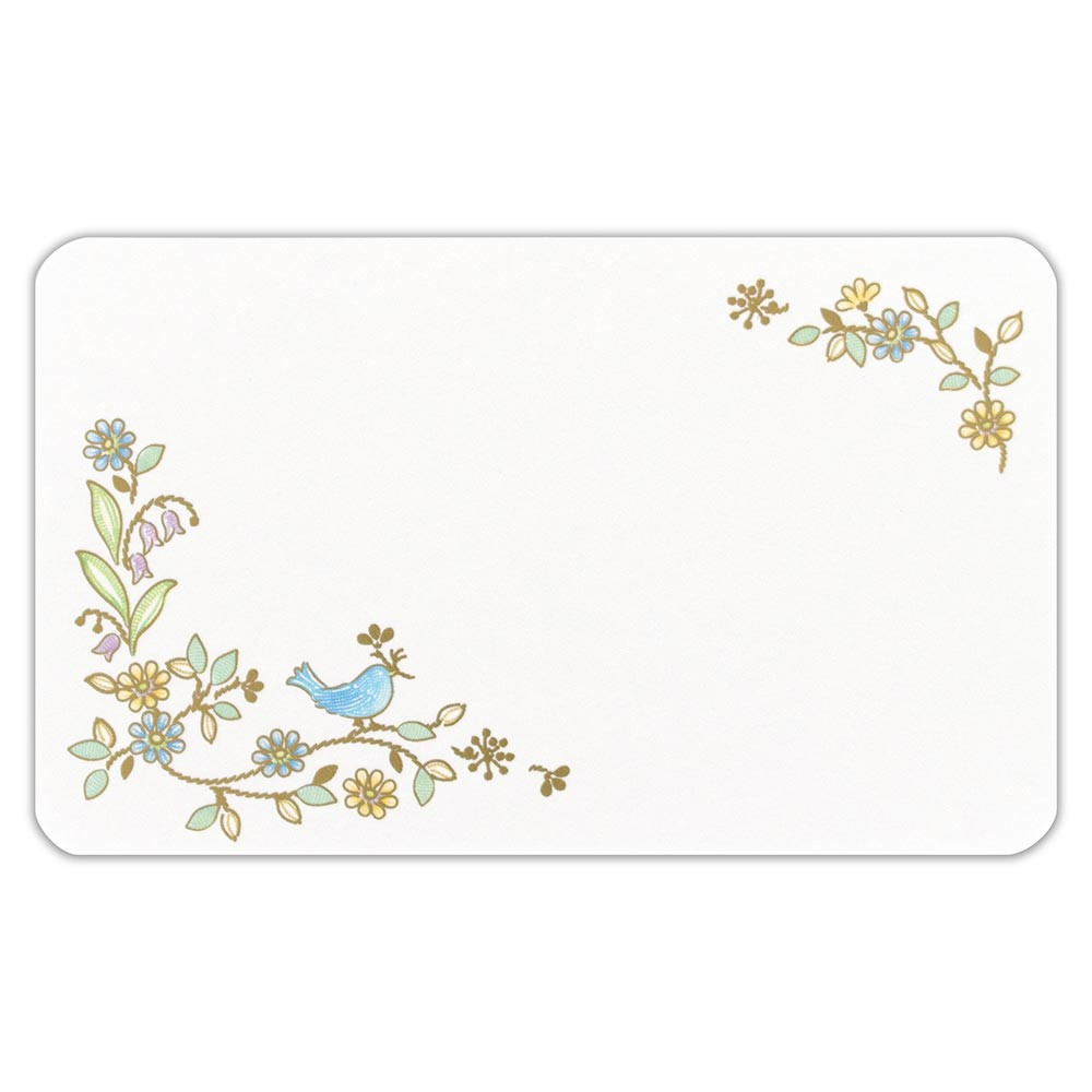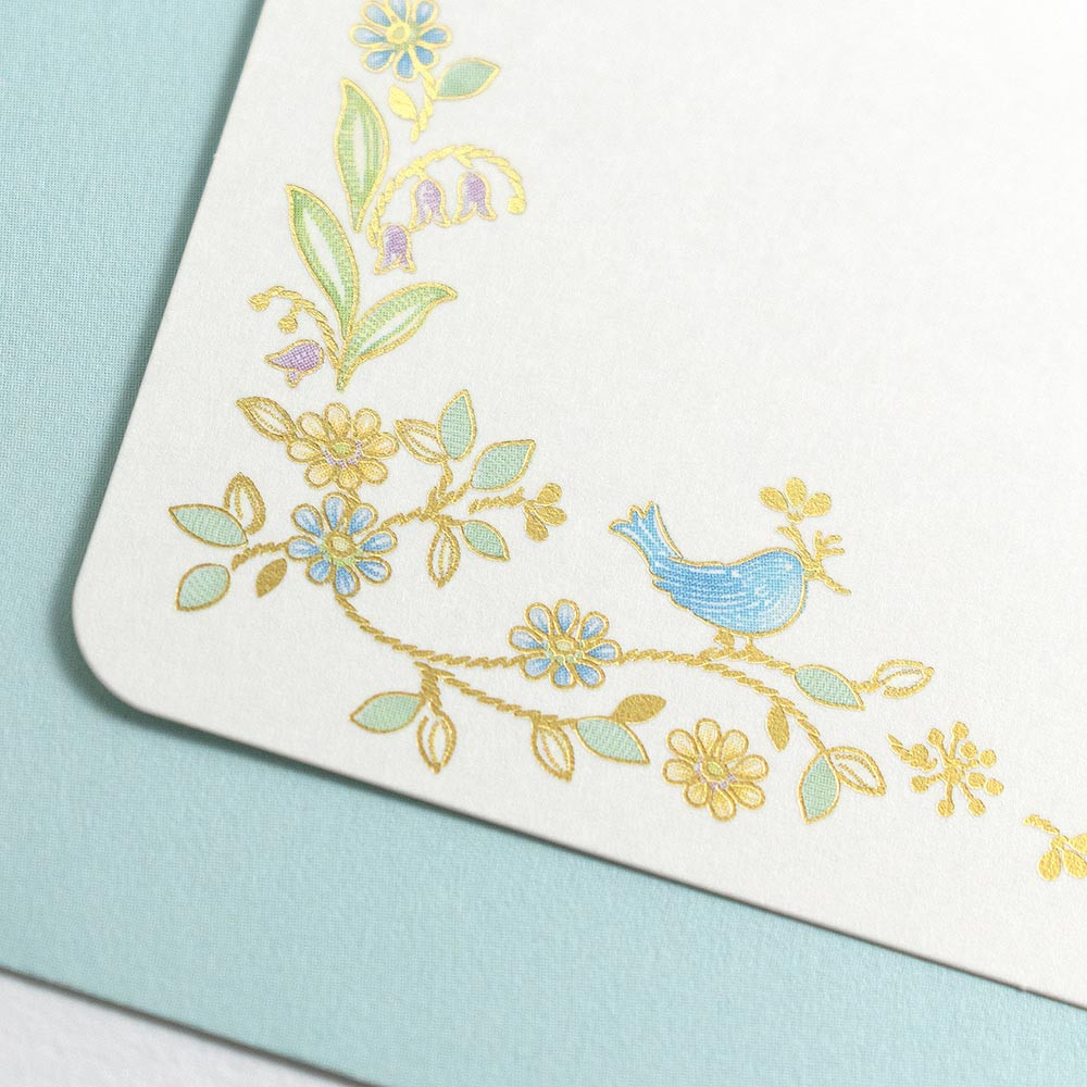 繊細な金箔押し加工を施した封筒付きのメッセージカードです。 青い小鳥とブルーデイジーが可愛らしいデザインです。