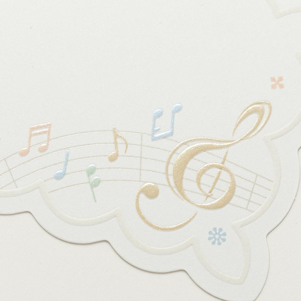 柔らかく輝く音符が可愛らしいメッセージカードです。 音符モチーフが好きな方やちょっとしたギフトに添えるカードとしてもおすすめです。