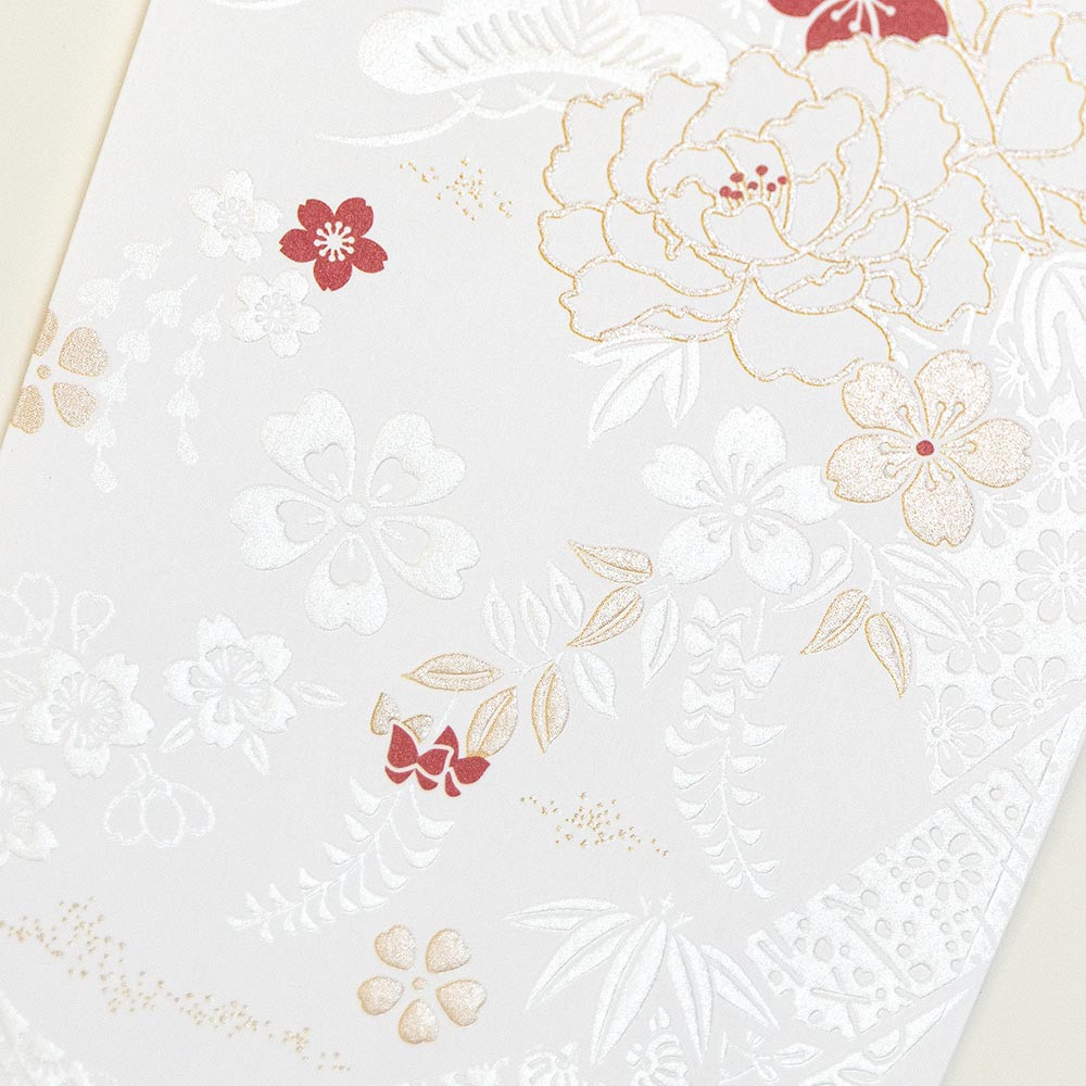 牡丹、桜、松竹梅、藤などの花や束ねのしなど、縁起のいい紋様を使ってデザインしました。