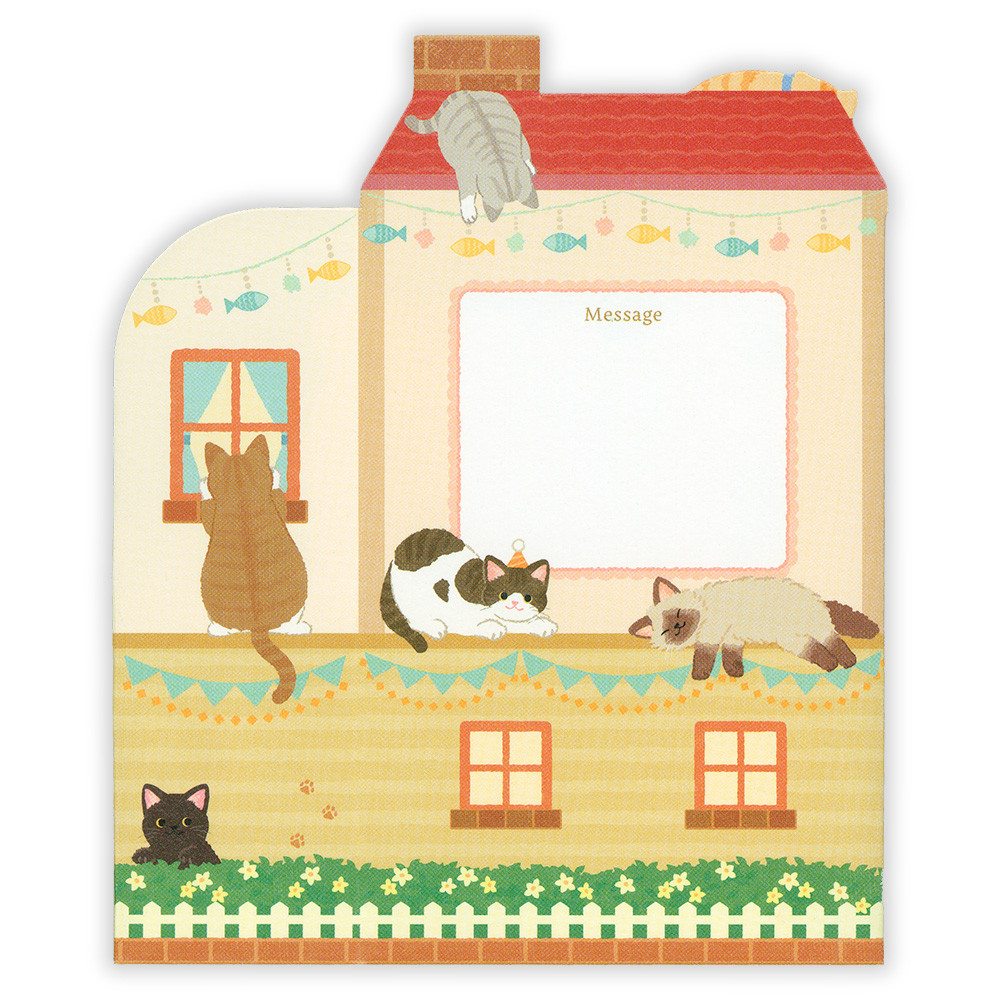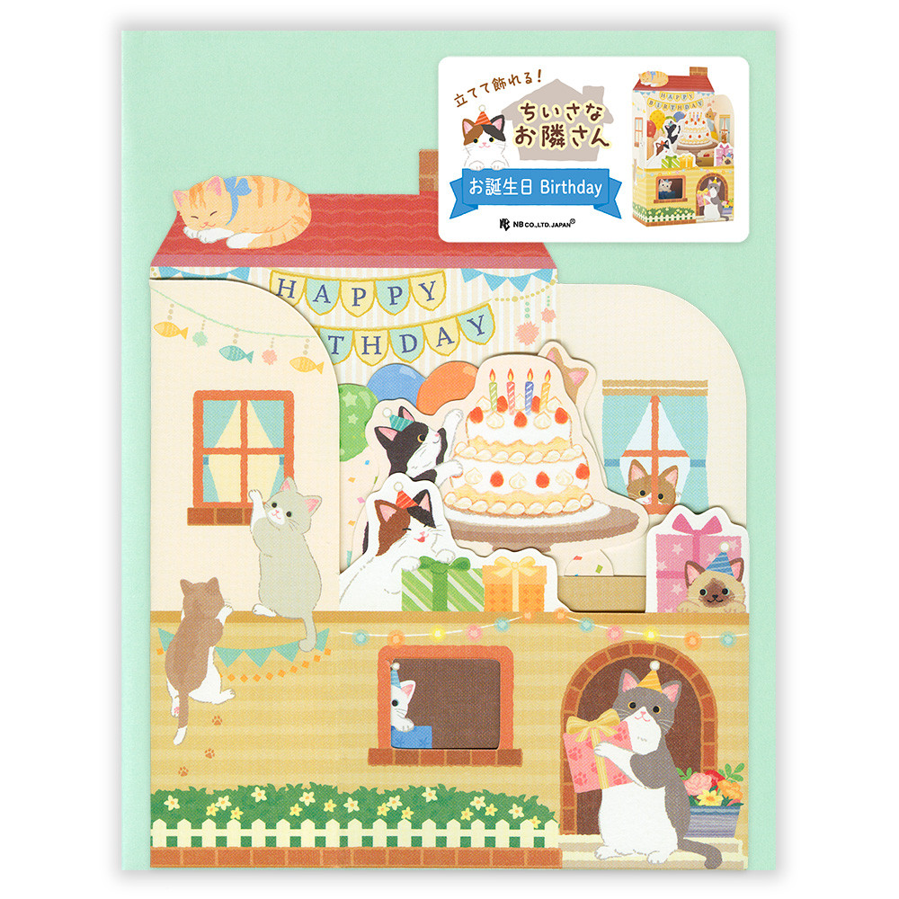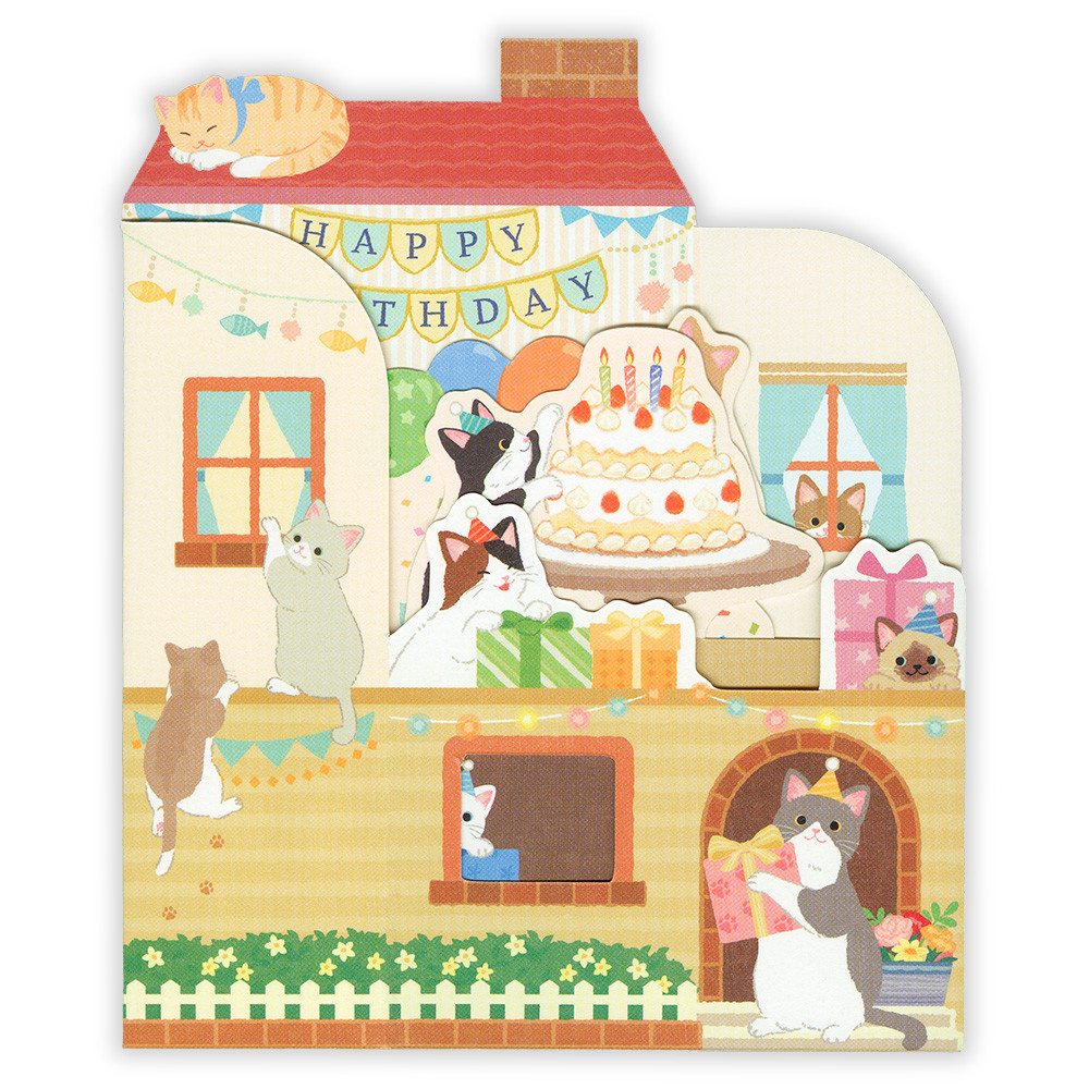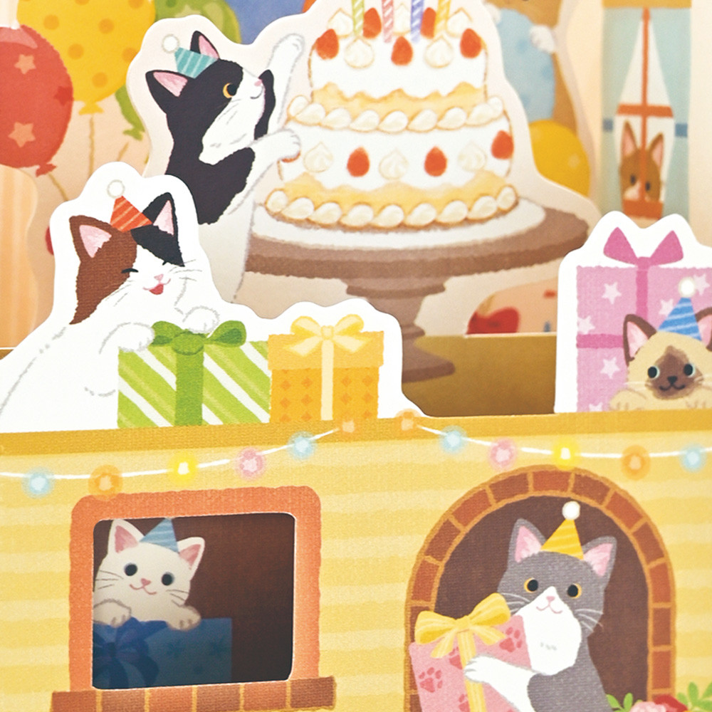 猫たちがホームパーティーを開いて誕生日をお祝いしてくれるデザインです。