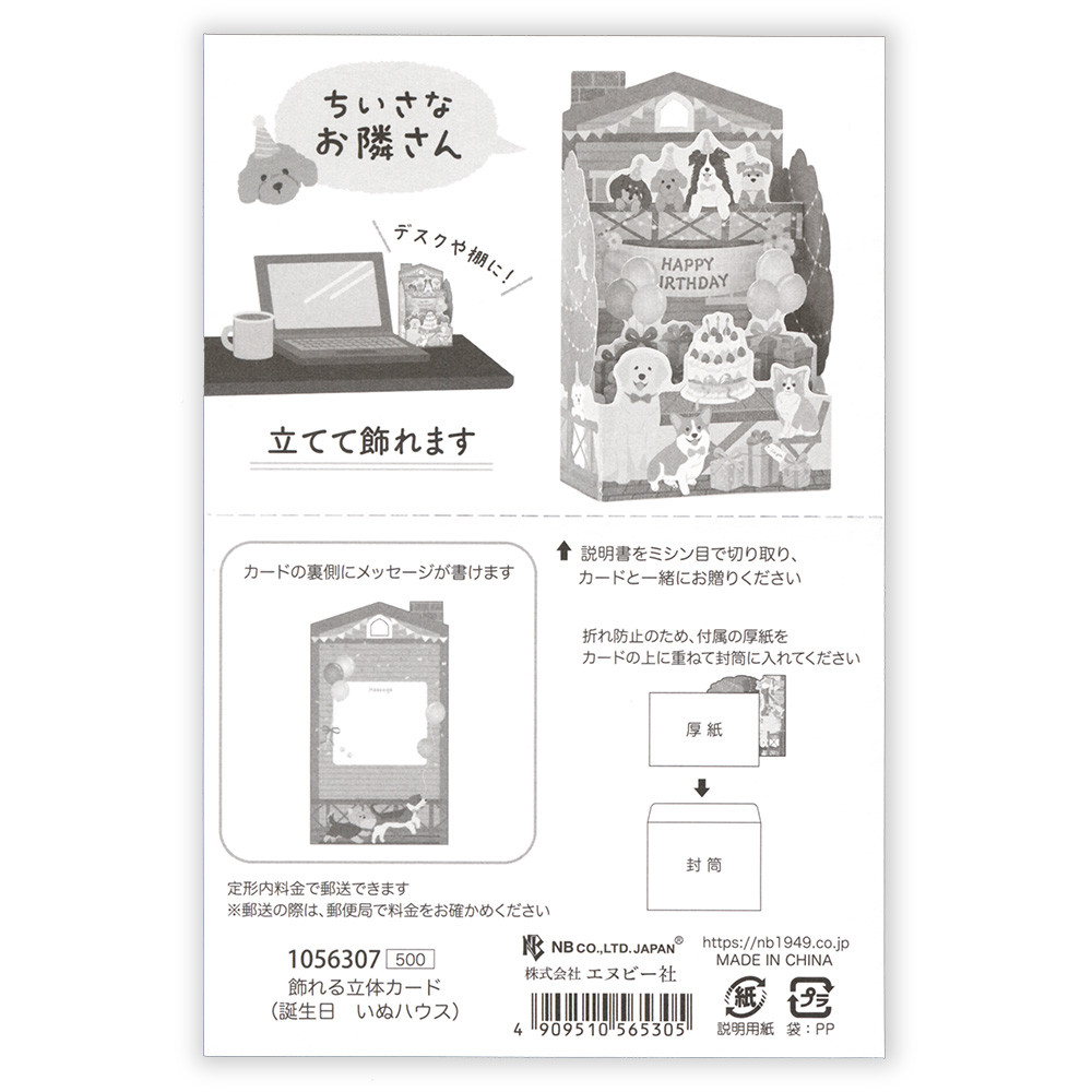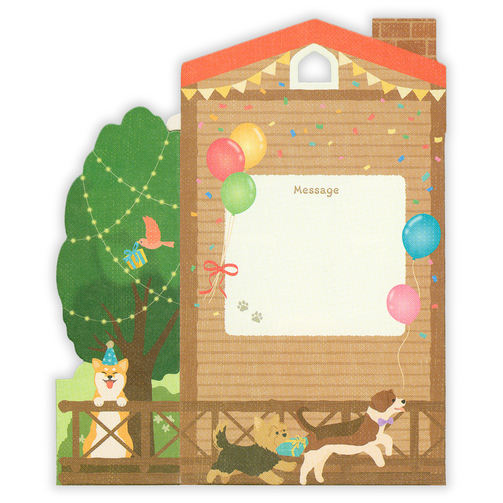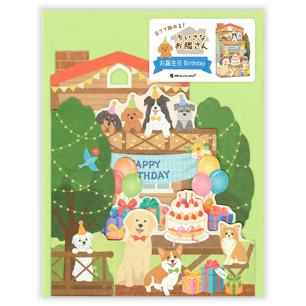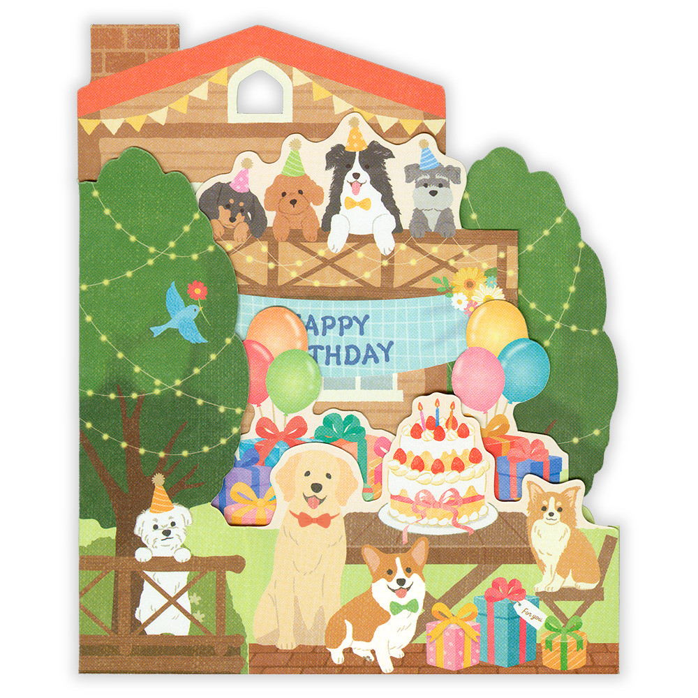 犬たちがガーデンパーティーを開いて誕生日をお祝いしてくれるデザインです。
