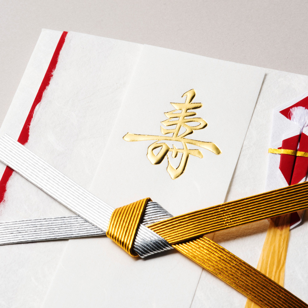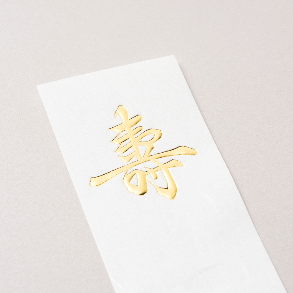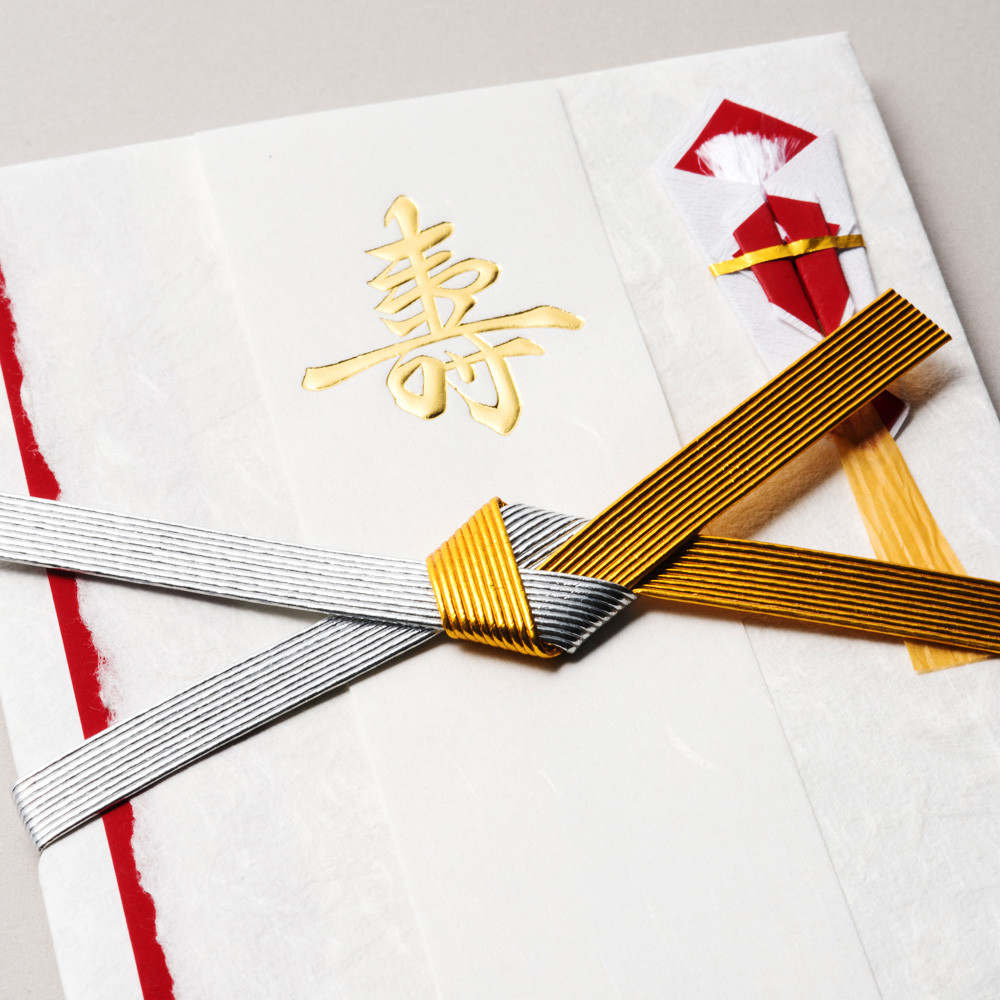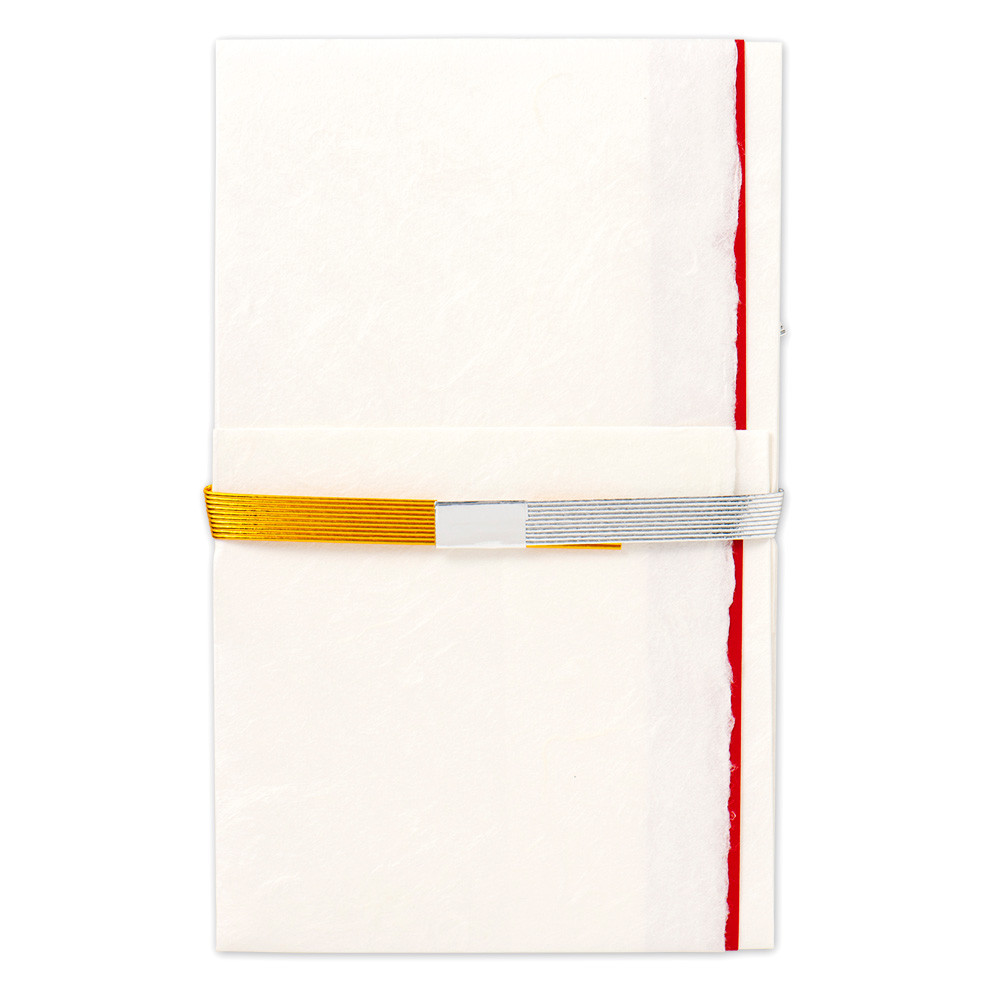 伝統的な紙の風合いを活かしたシンプルなデザインに、金銀2色の水引が豪華に飾られた品格のある金封です。
