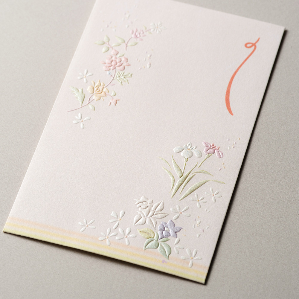 花柄の優しく繊細な雰囲気のエンボス加工が施されたぽち袋です。 上品な輝きによって華やかさを演出します。【小紋】