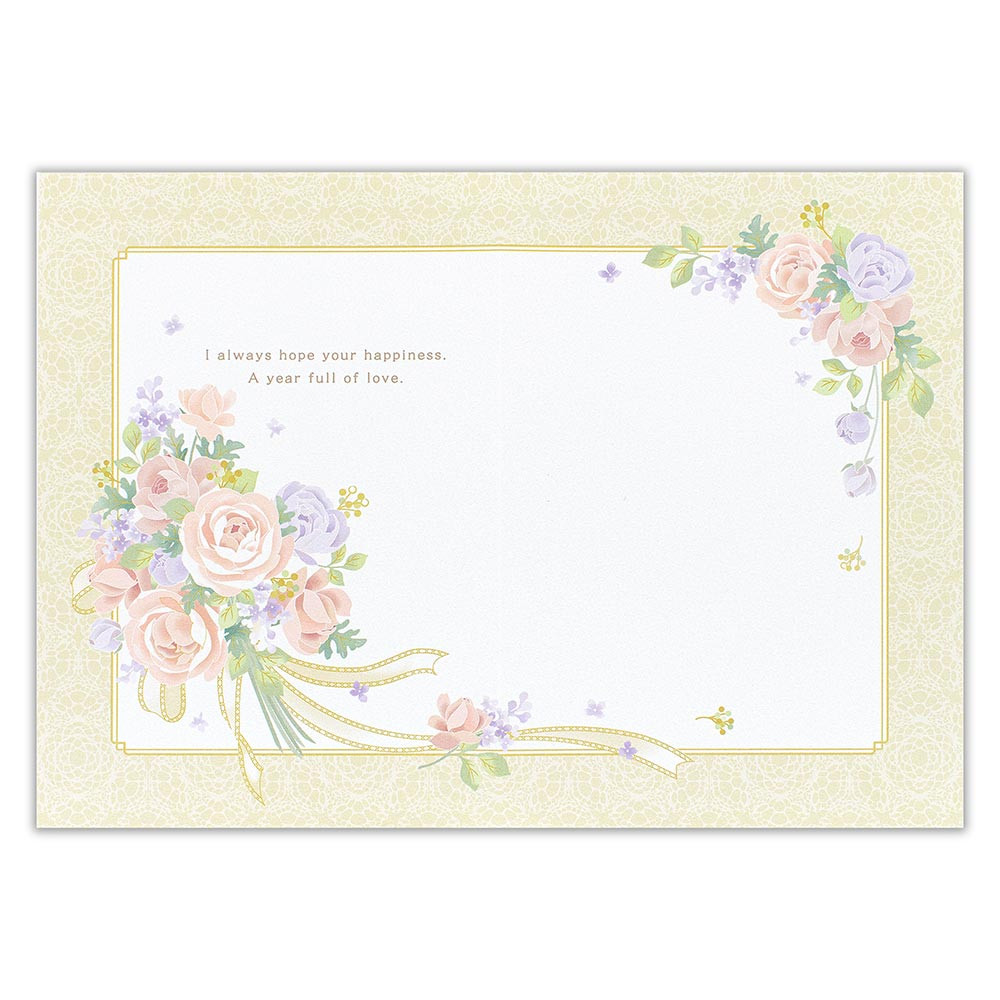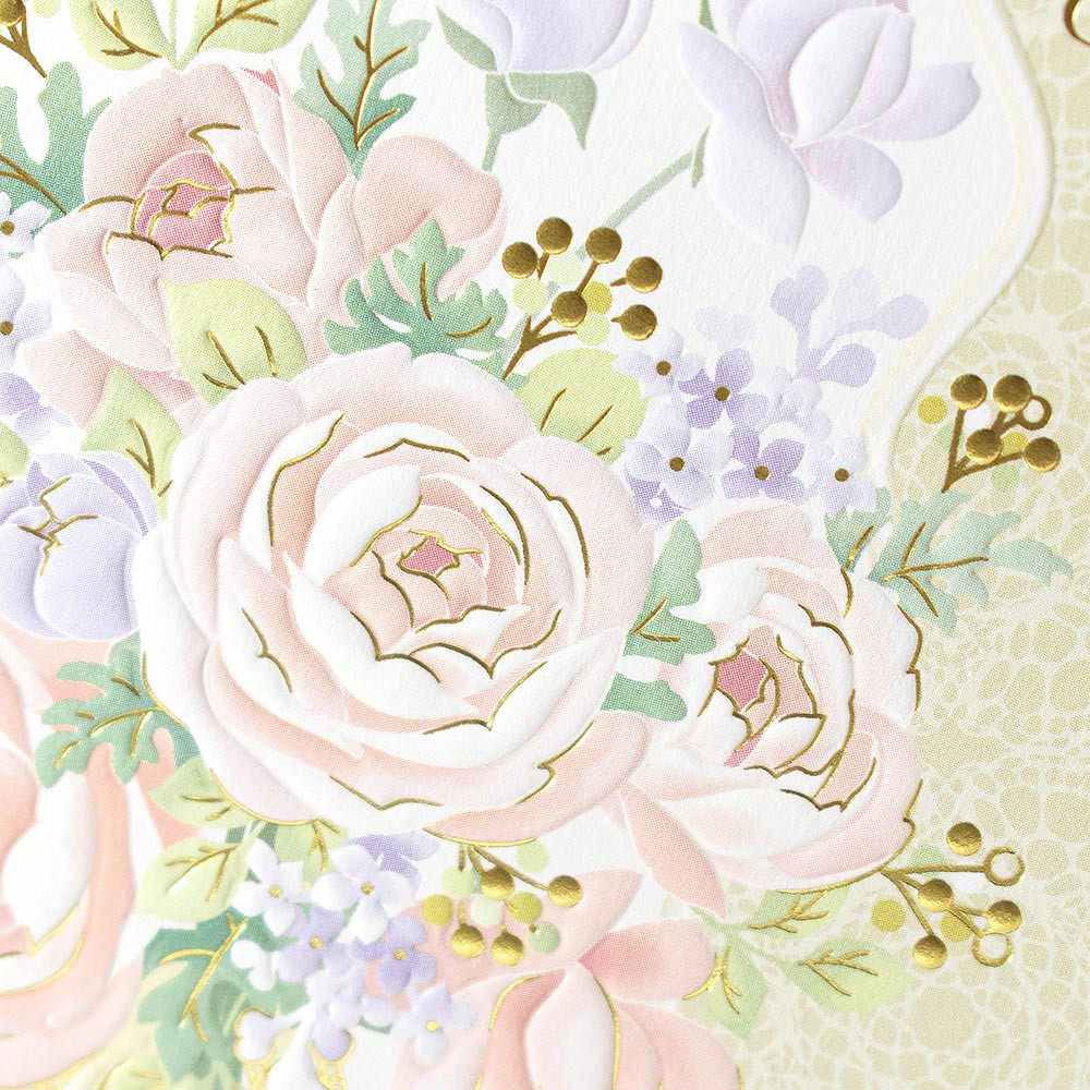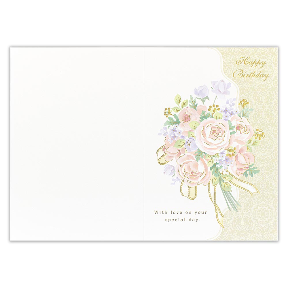 キラリと輝く金箔押しとエンボス加工を施した、上品なバースデーカードです。 淡い色味のバラのブーケとレースの絵柄が華やかなデザインです。