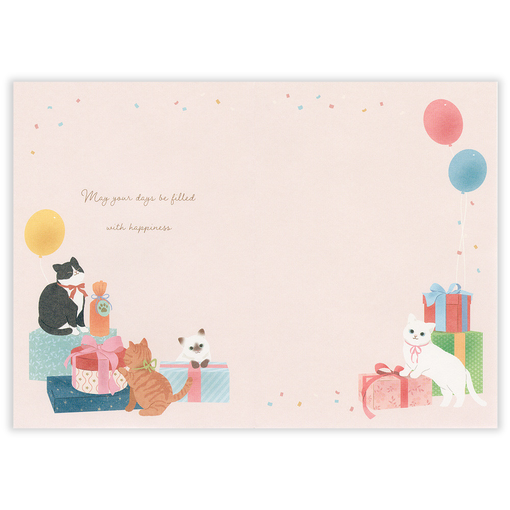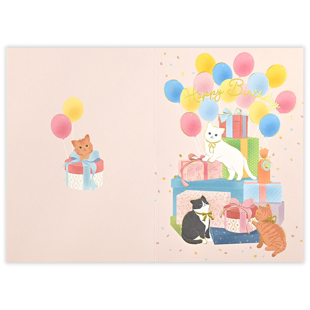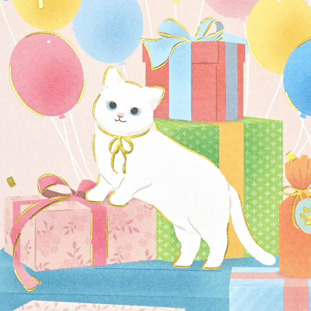 リボンでおめかしした猫たちと、カラフルなプレゼントや風船がお誕生日にぴったりなデザインです。