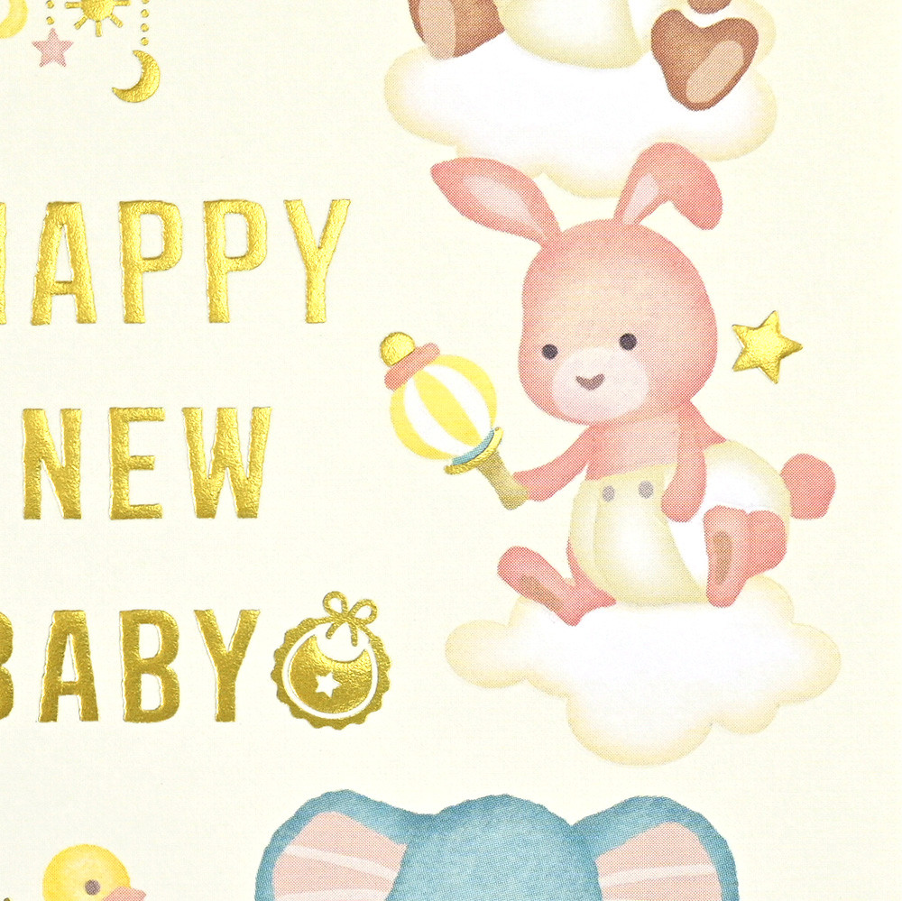 キラリと輝く金箔押しとエンボス加工を施した、出産お祝いのカードです。