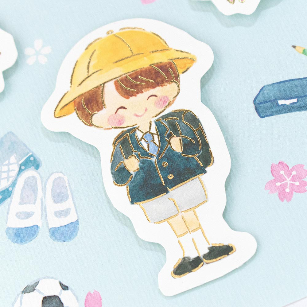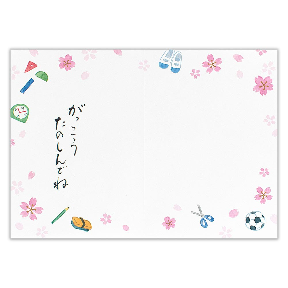 男の子、桜、教科書、カスタネット、定規、サッカーボールなどが描かれています。
