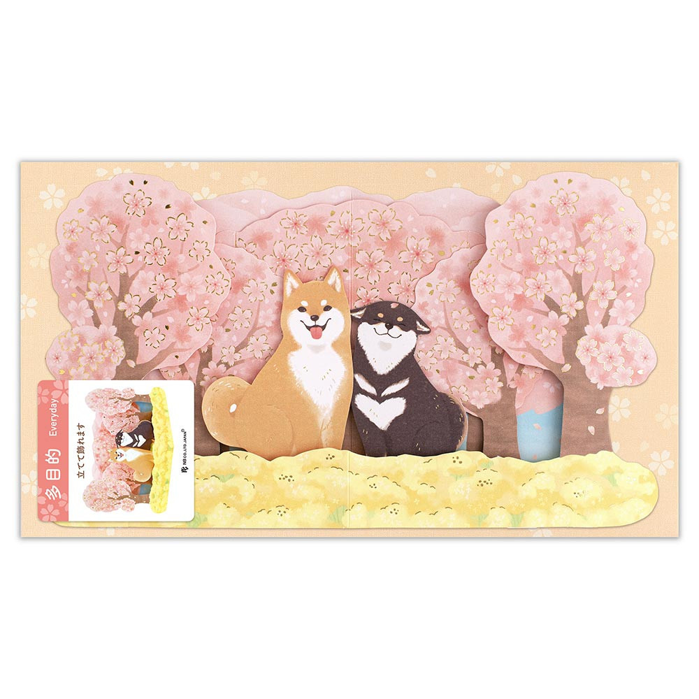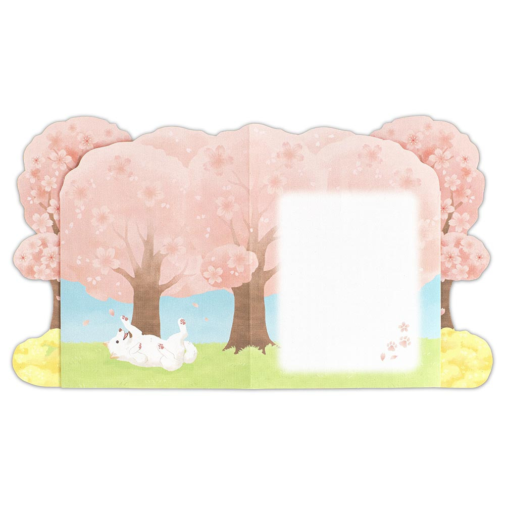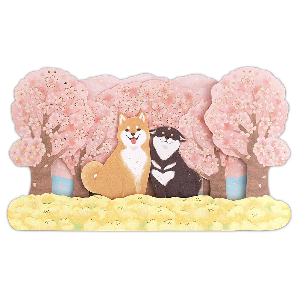 満開の桜並木に菜の花畑、可愛らしい表情の柴犬を描きました。
