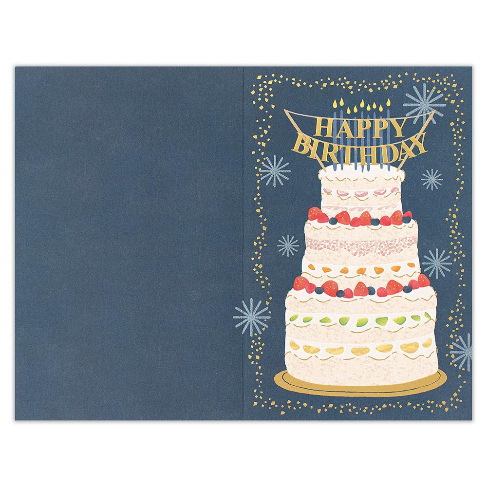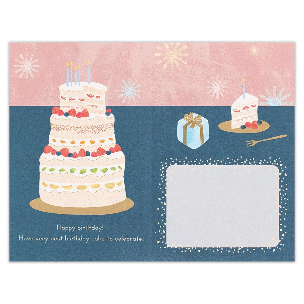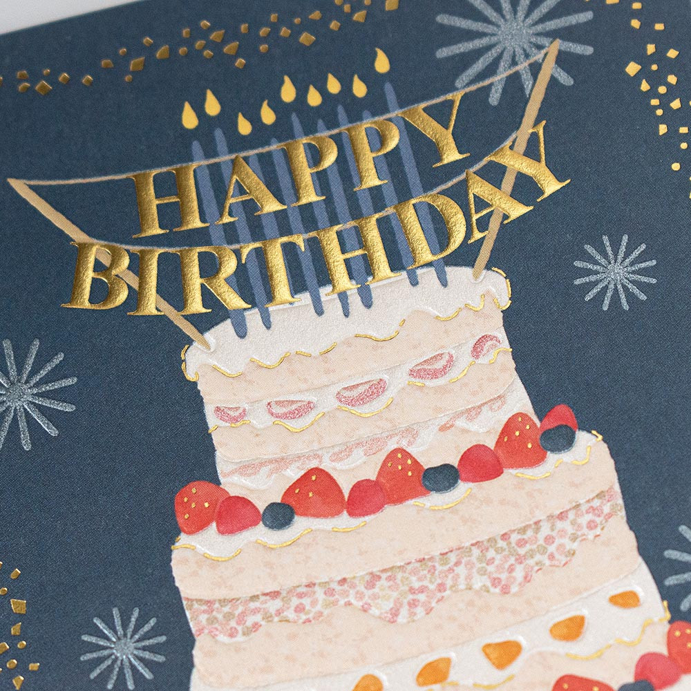 金箔押し加工やエンボス加工を贅沢に用いた、華やかなお誕生日カードです。 大きなお誕生日ケーキを描きました。