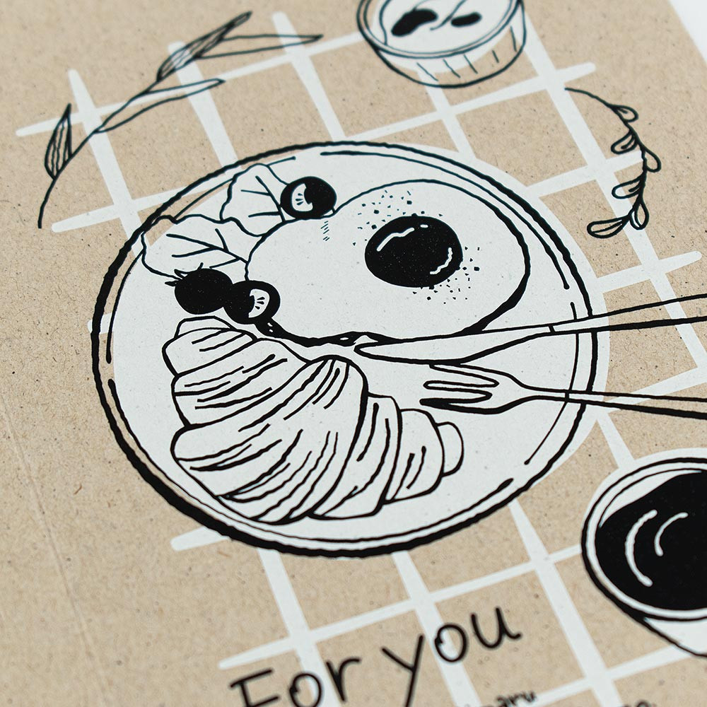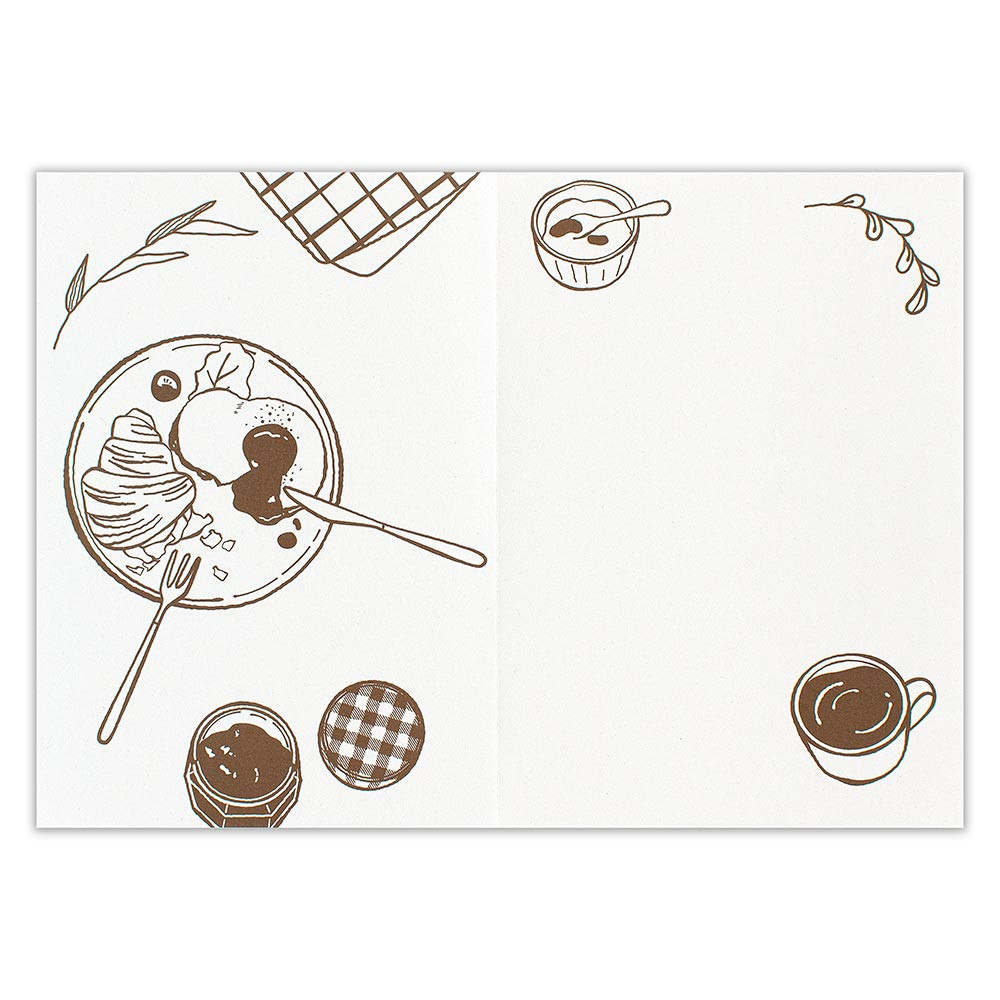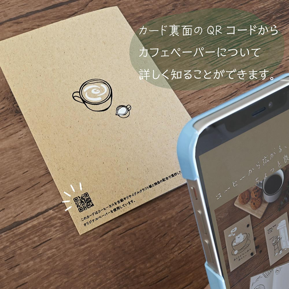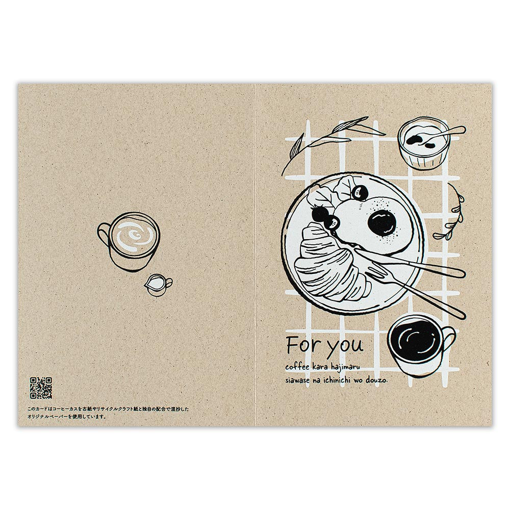 カード本体にコーヒーかすの再生紙を使用した、サステナブルなカードです。コーヒーのある食卓を描きました。