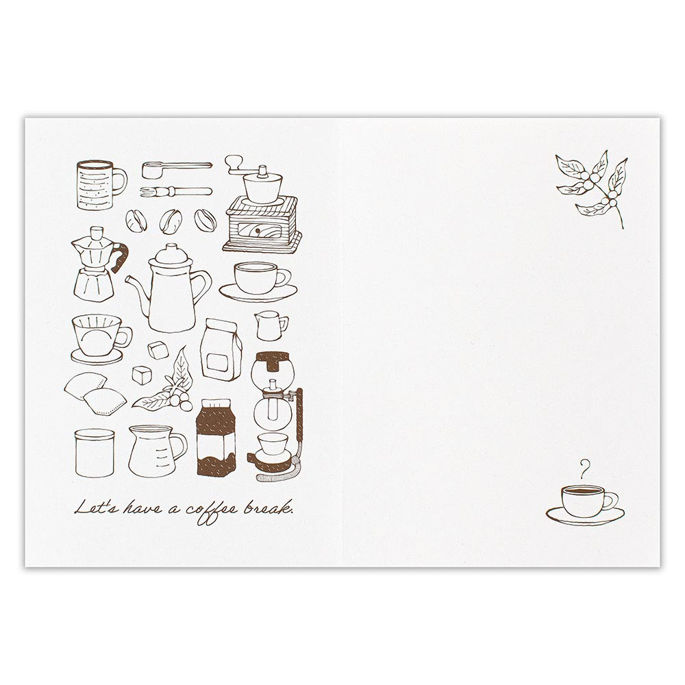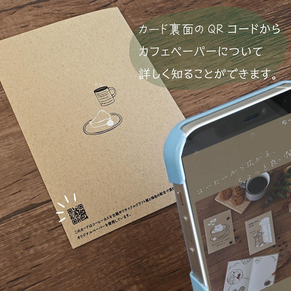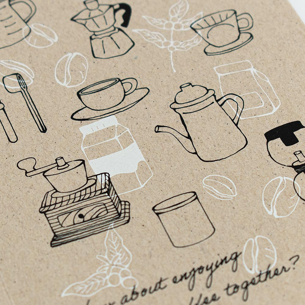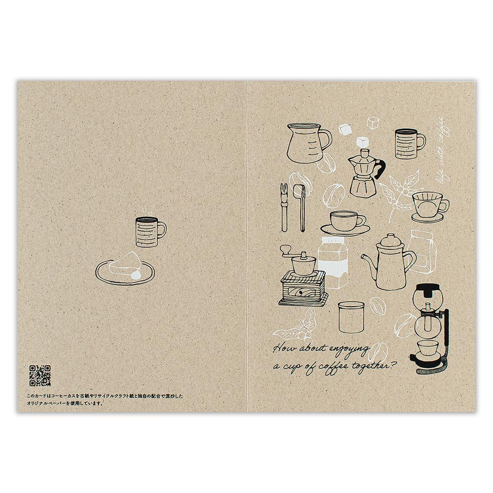 カード本体にコーヒーかすの再生紙を使用した、サステナブルなカードです。コーヒーミルやサイフォンなどのコーヒーを淹れる道具を描きました。