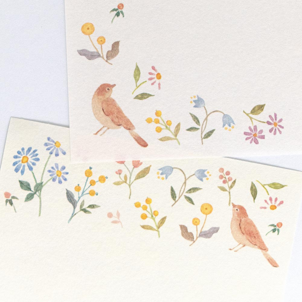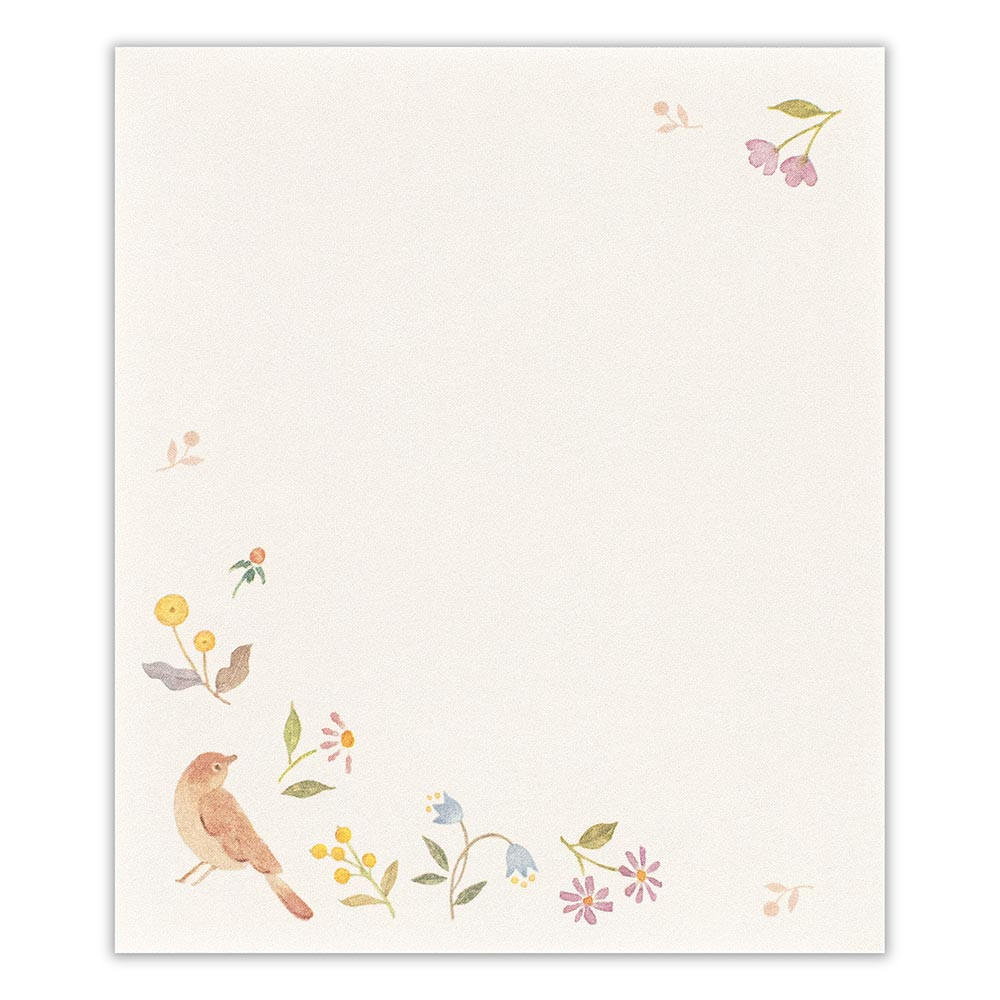 “小鳥や花々に彩られた庭”をイメージし、「さえずる小鳥たち」「優しく揺れる花々」「そよ風が吹く庭」をキーワードに描きました。