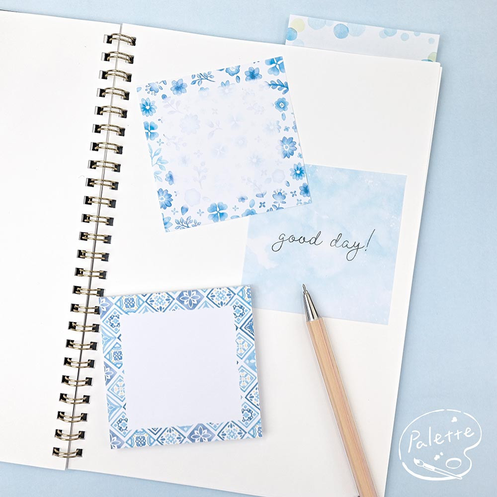 爽やかなブルーでタイル・にじみ・草花・水玉を描きました。メッセージを書き込んだり、手帳デコにもおすすめです。