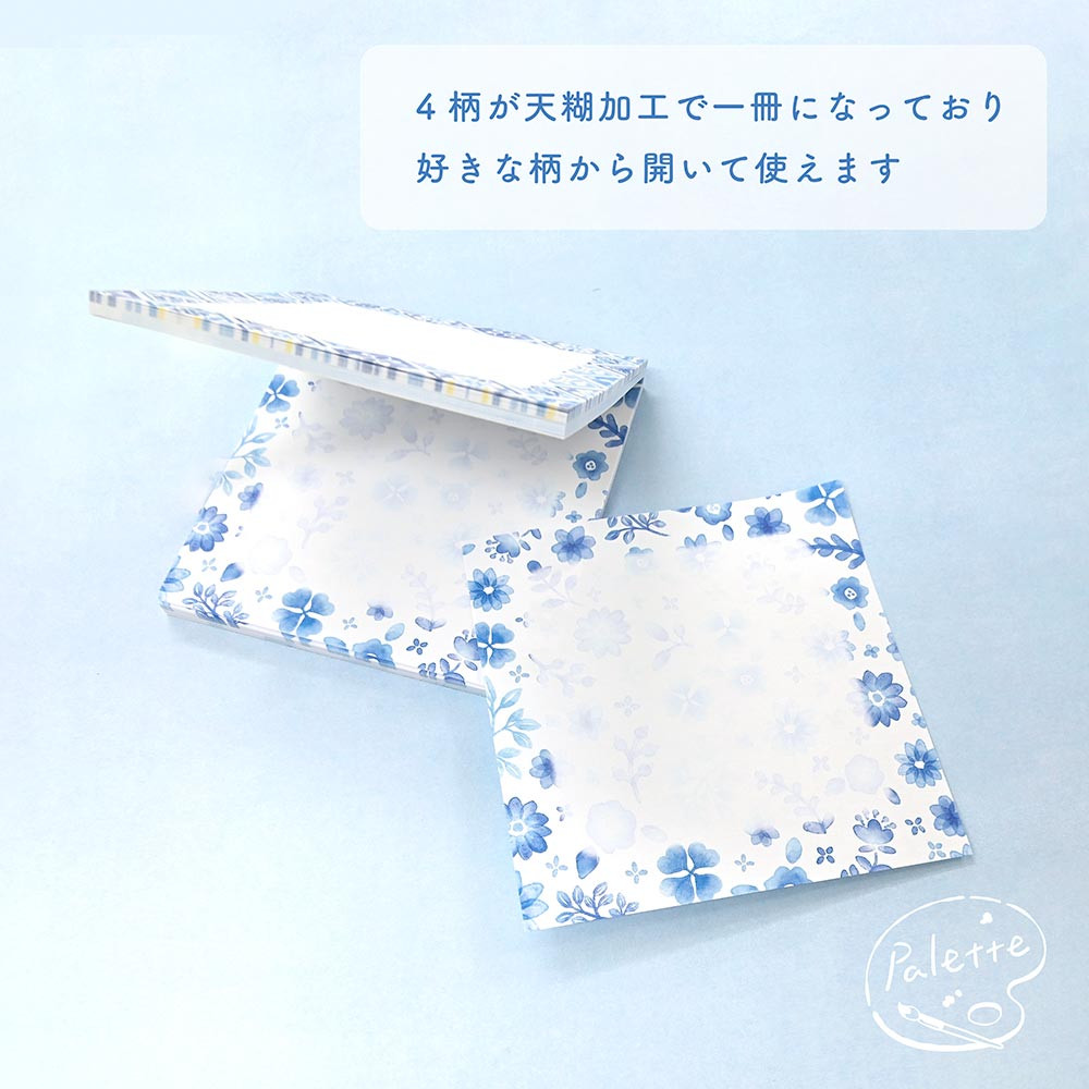 4柄のふせんが天糊加工で一冊になっており、好きな柄から開いて使えます。