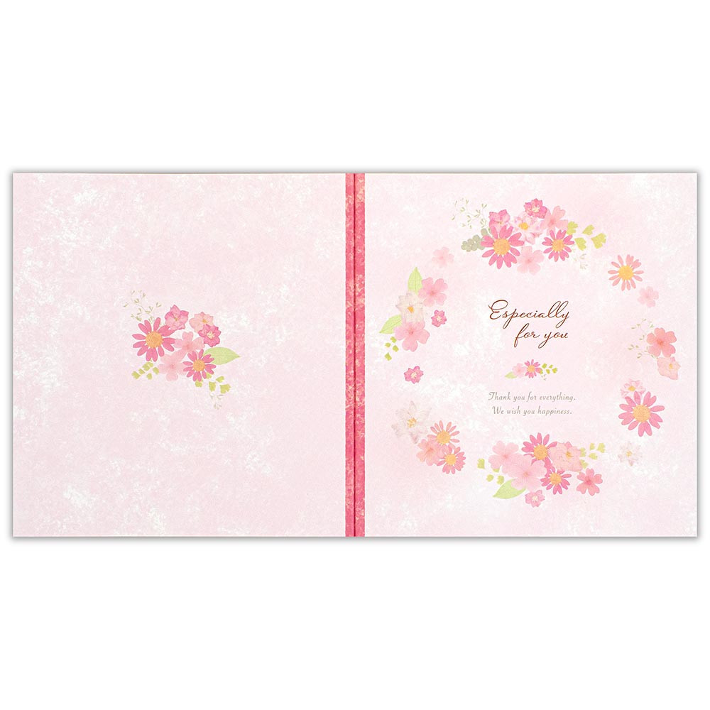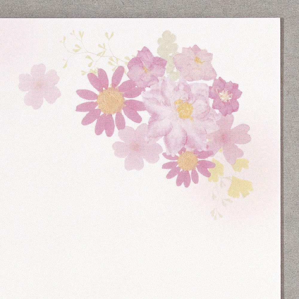 優しいピンクの花々が散りばめられた押し花柄で、どの年代に送るにも使いやすいデザインです。