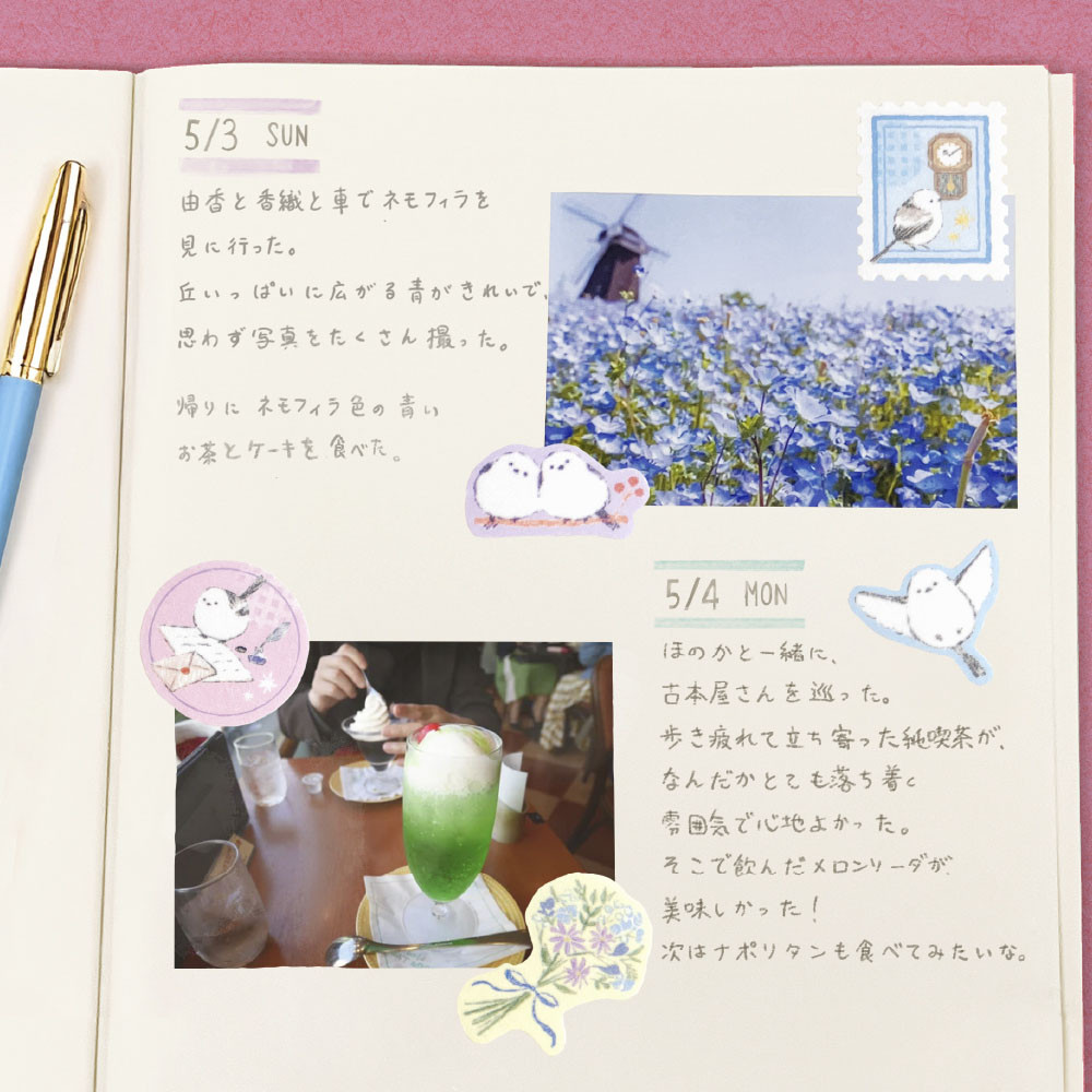 シマエナガや花などを優しく描きました。