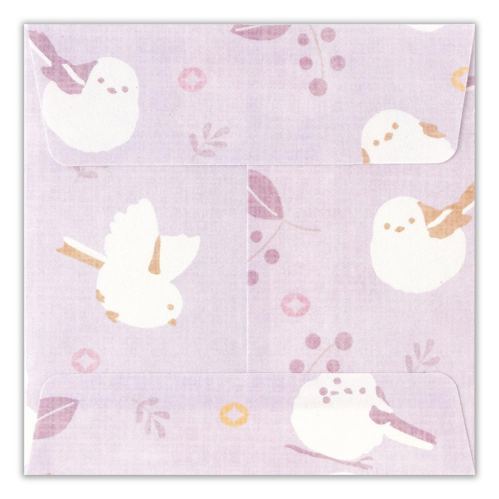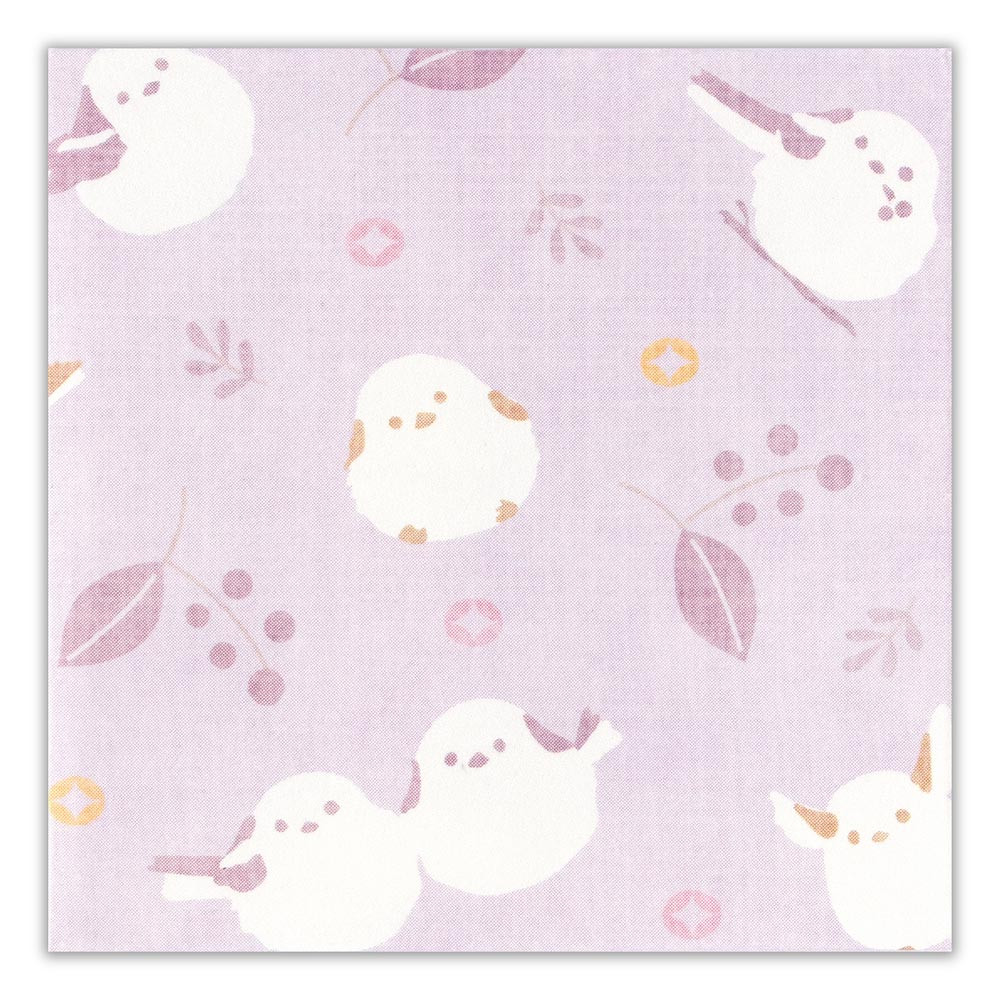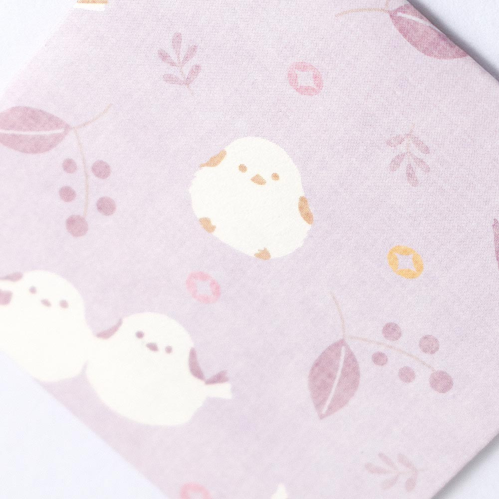 雪の妖精シマエナガや、縁起の良い和紋様の「七宝」などのモチーフが描かれています。