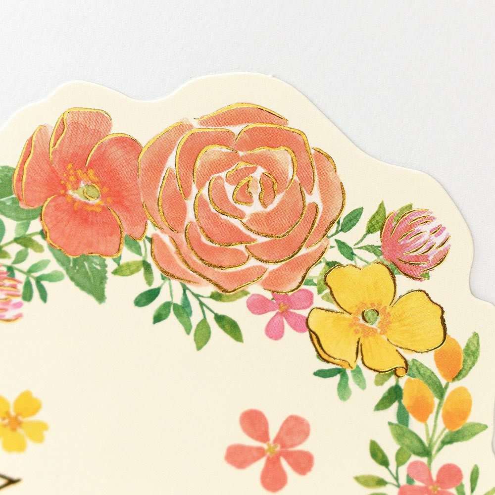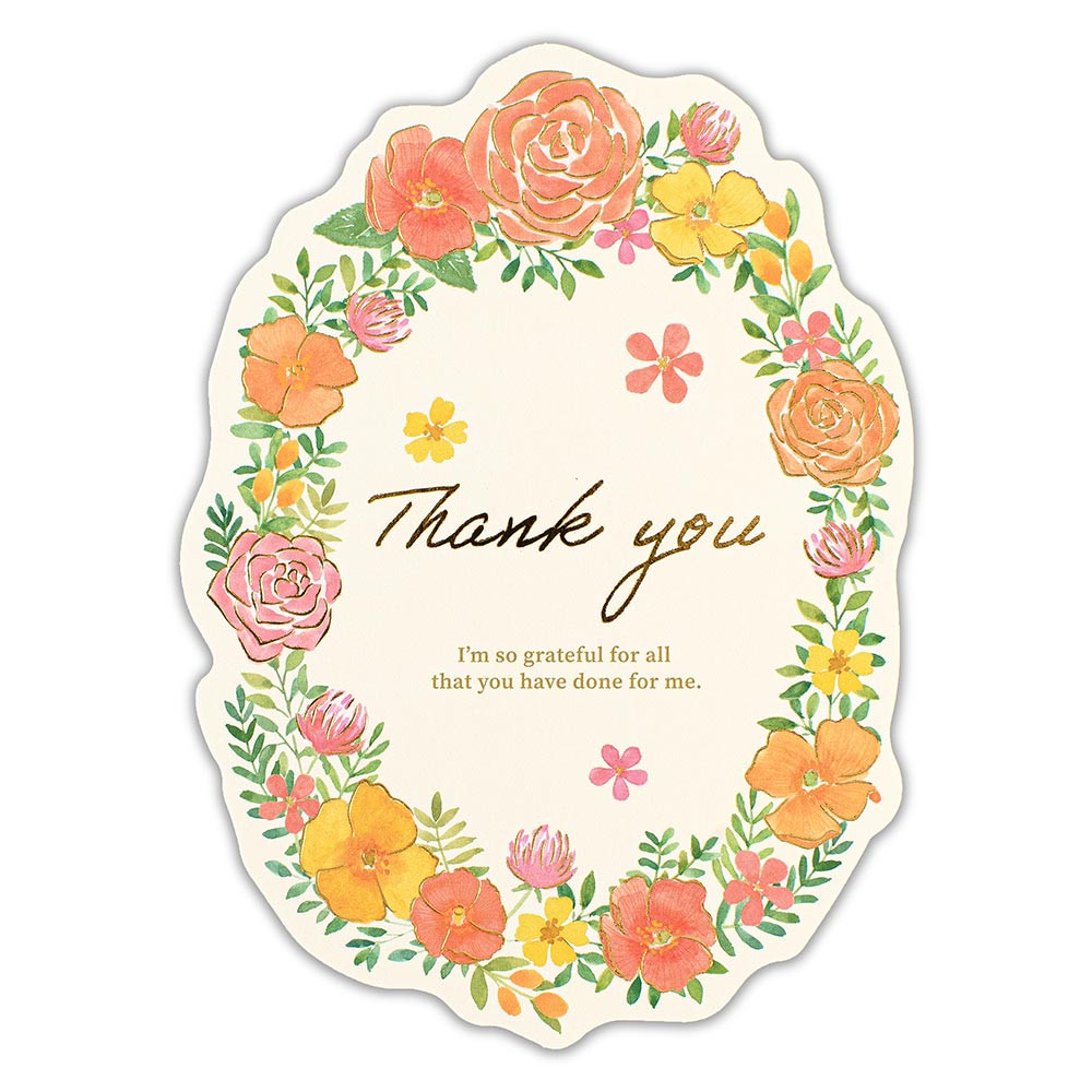 レッドカラーのフラワーリースを水彩タッチで優しく描いたダイカットカードです。