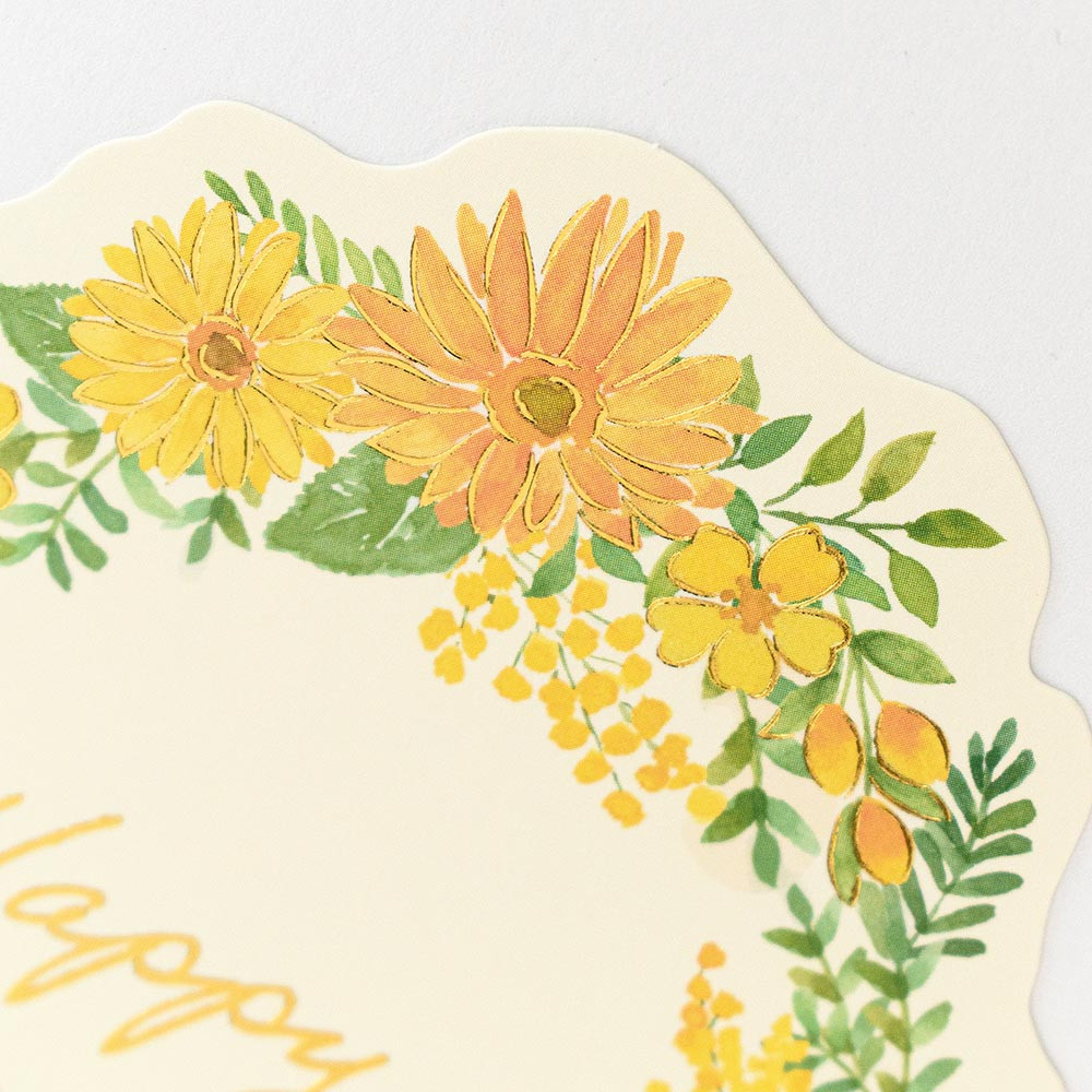 イエローカラーのフラワーリースを水彩タッチで優しく描いたダイカットカードです。