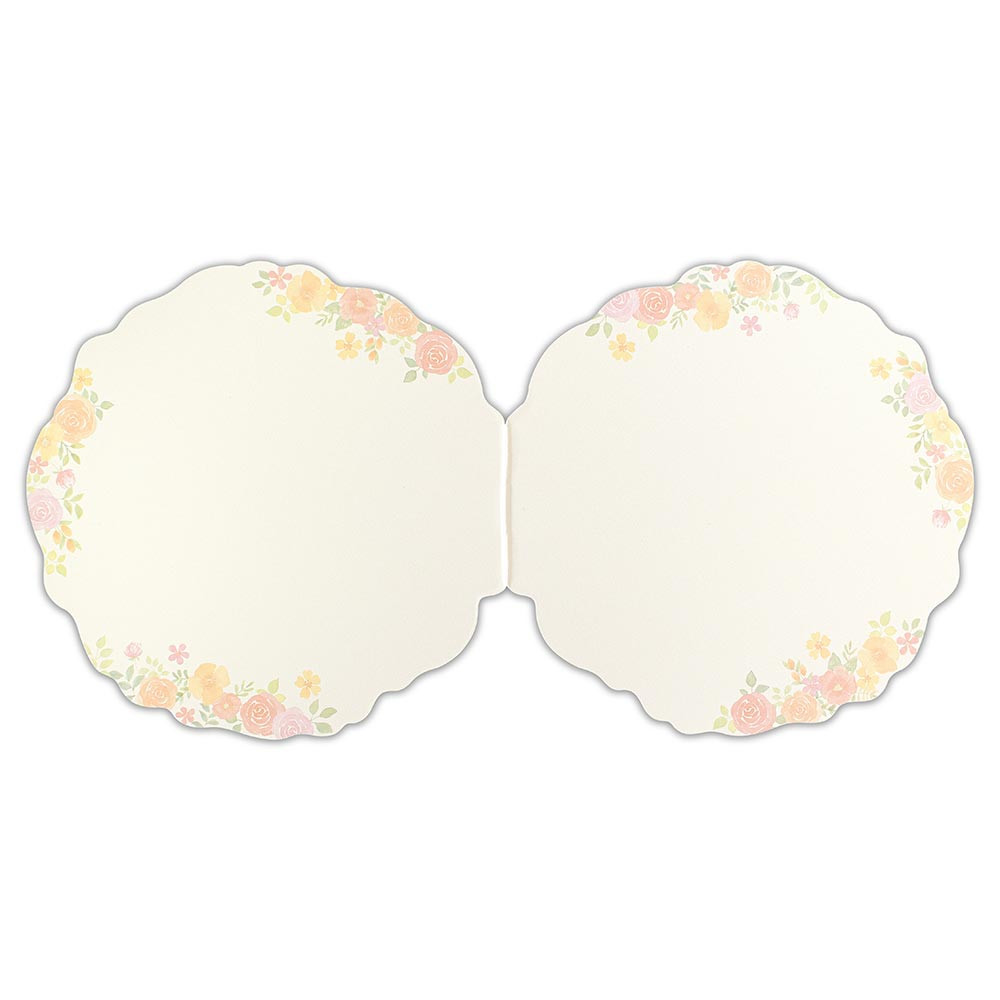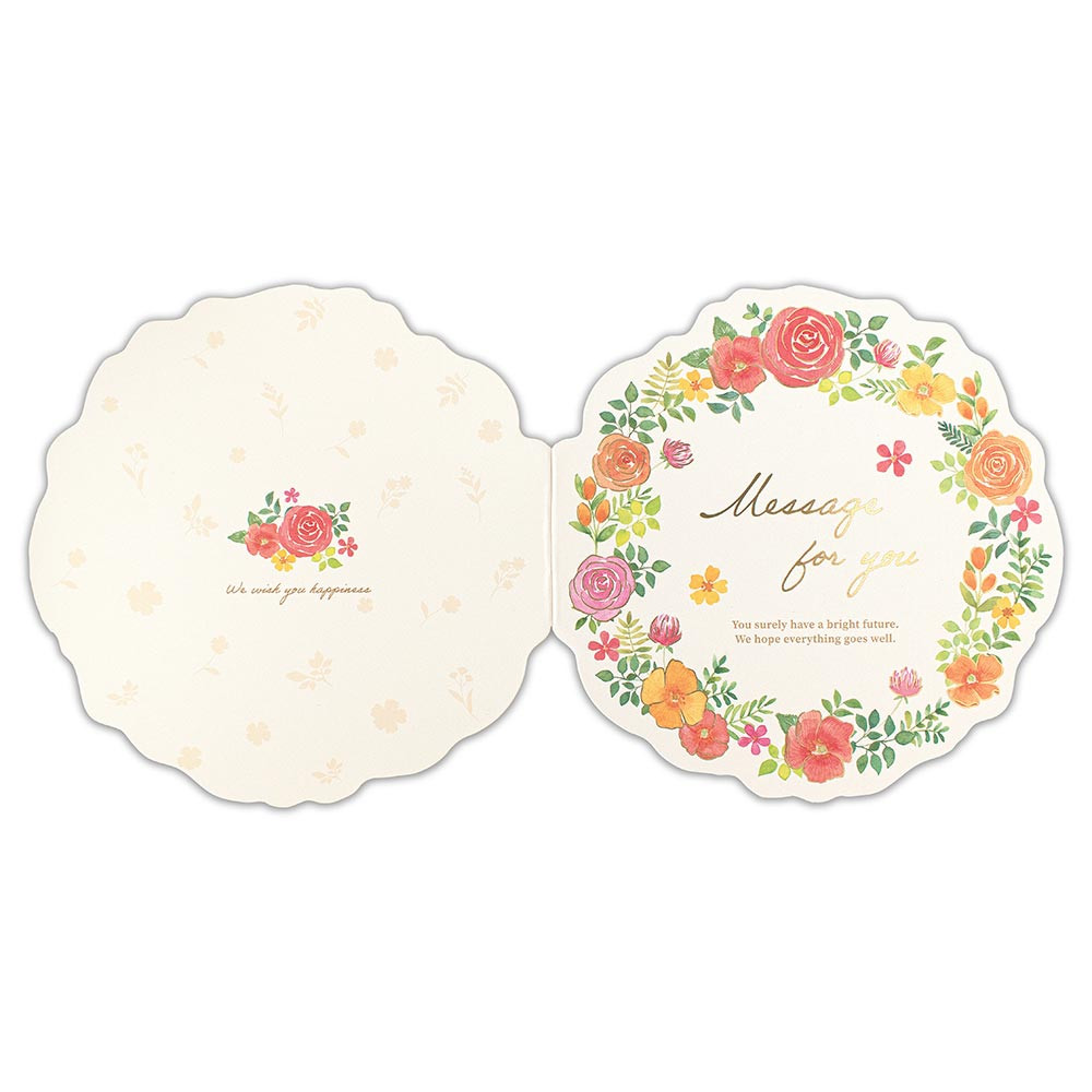レッドカラーのフラワーリースのようなダイカットが特徴の二つ折り色紙です。