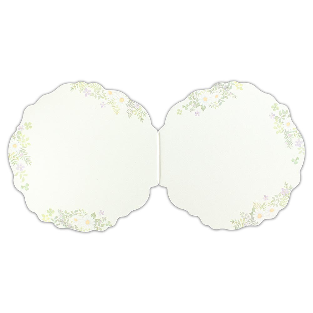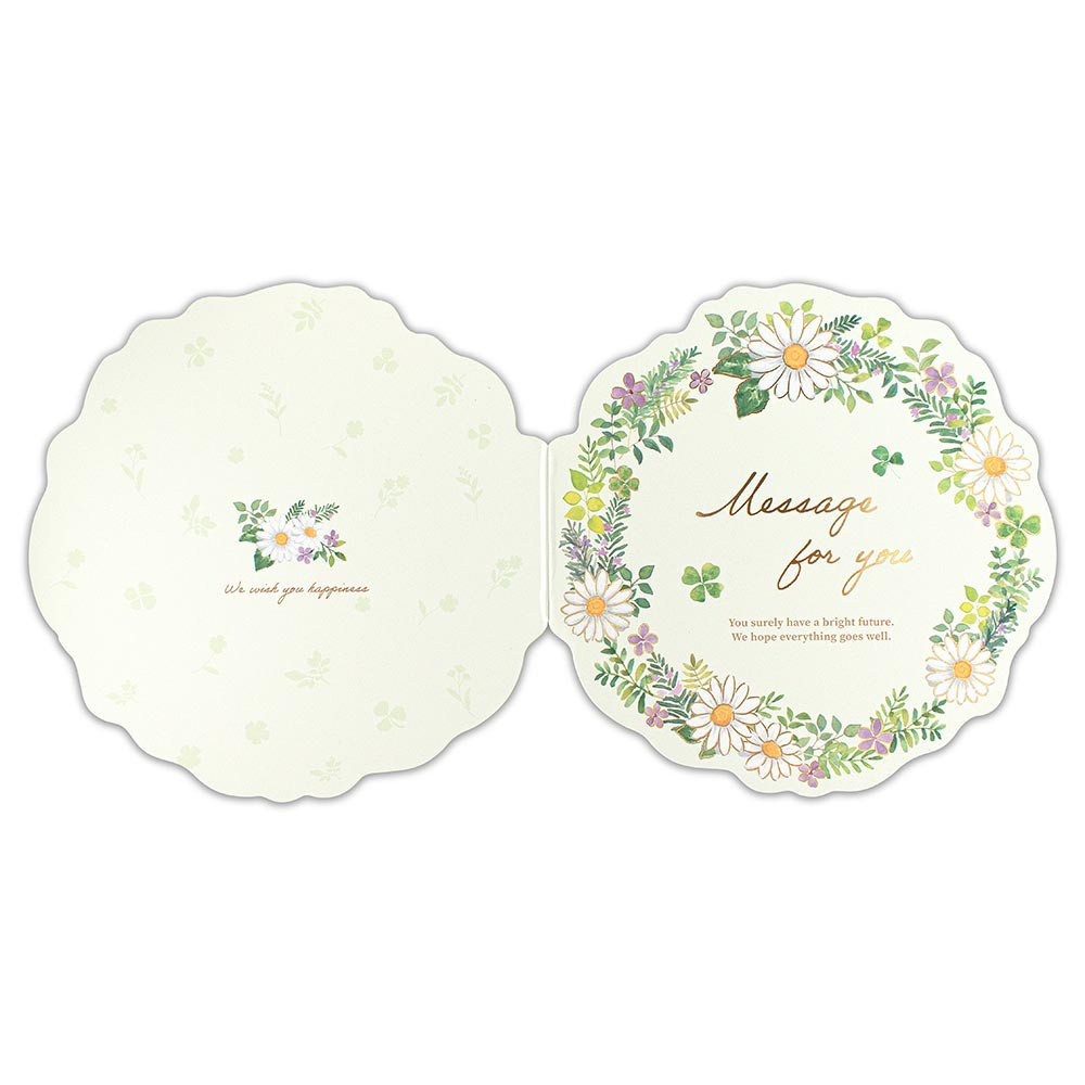 グリーンカラーのフラワーリースのようなダイカットが特徴の二つ折り色紙です。