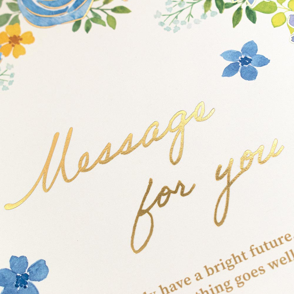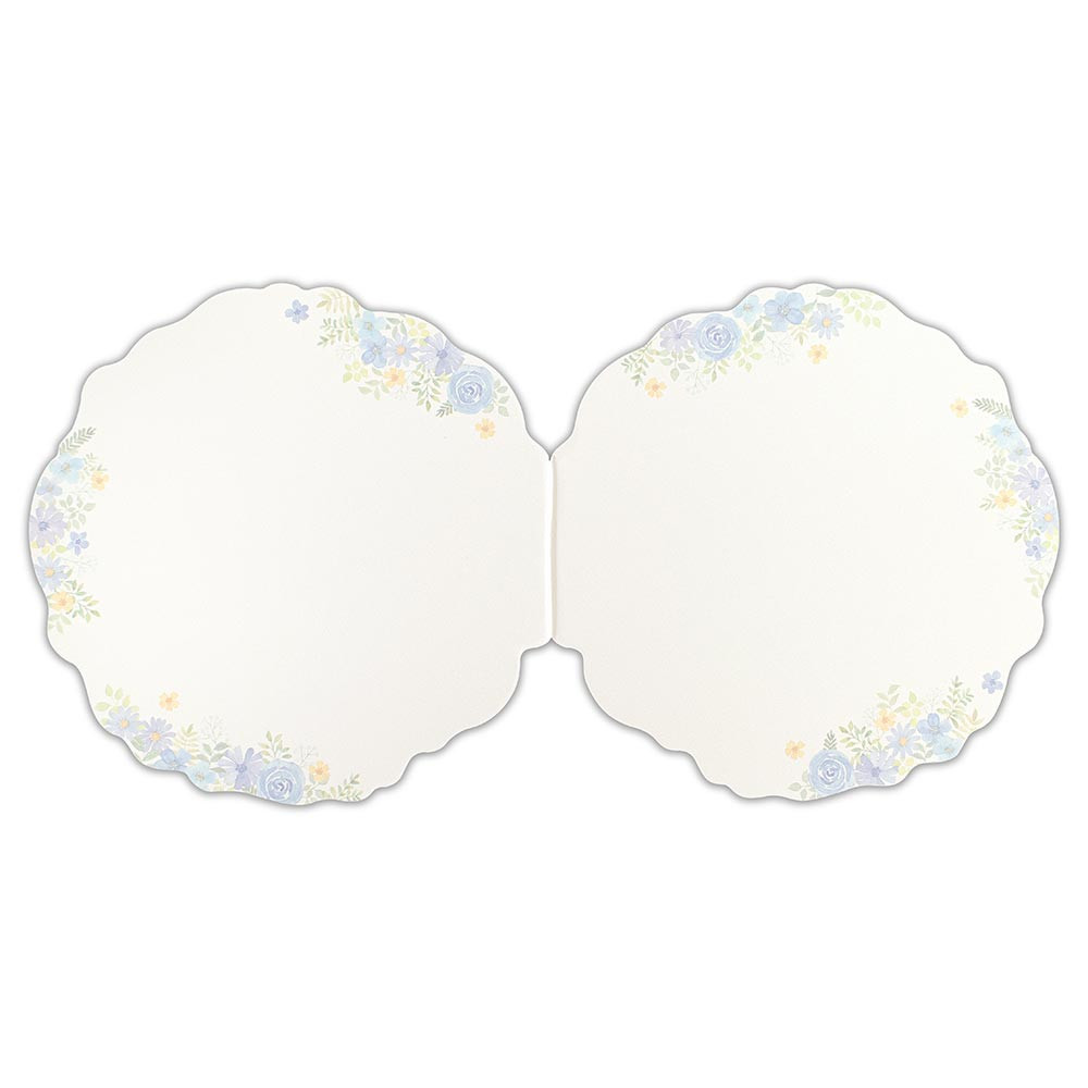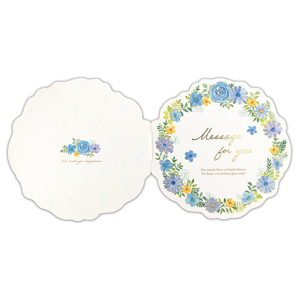 ブルーカラーのフラワーリースのようなダイカットが特徴の二つ折り色紙です。