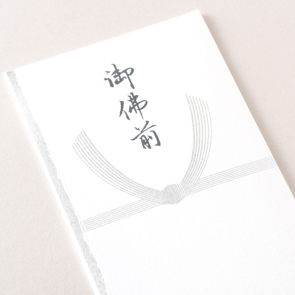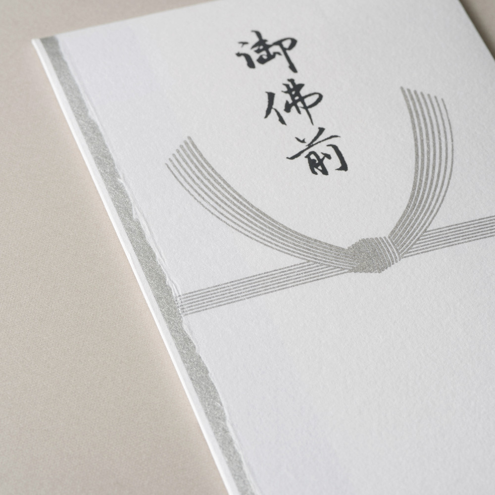 耳付鳥の子紙に銀シルク印刷やグレー箔押し加工を施しており、控えめながらも存在感のある不祝儀袋です。
