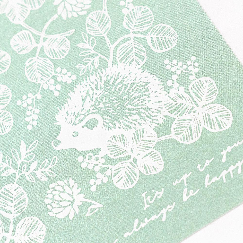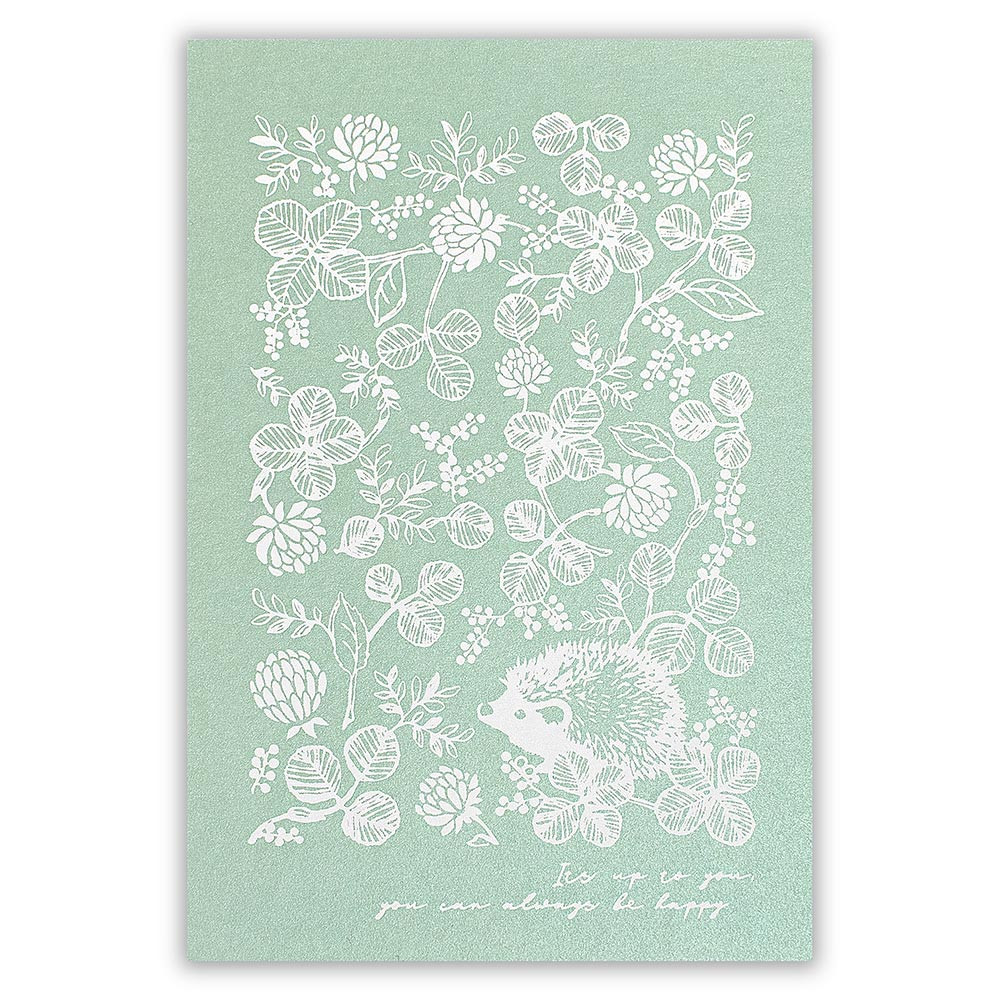「愛」「希望」「信頼」という意味を持つクローバーと、「出会うと幸せが訪れる」と言われるハリネズミを描いたデザインです。