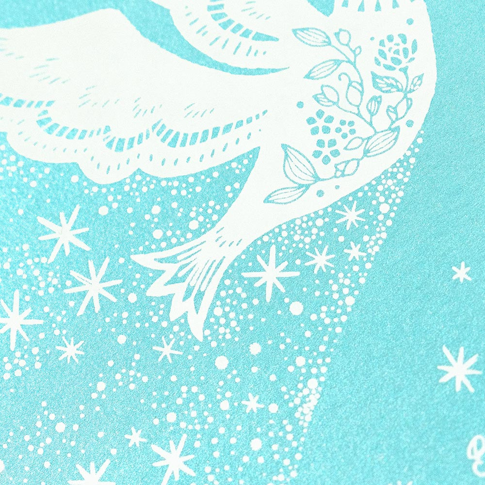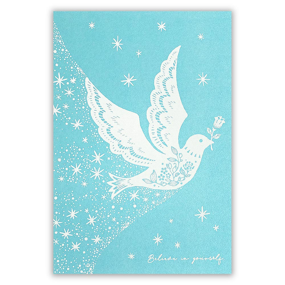 平和と愛の象徴とされ、幸運をもたらすとされる白いハトと輝く星を描きました。