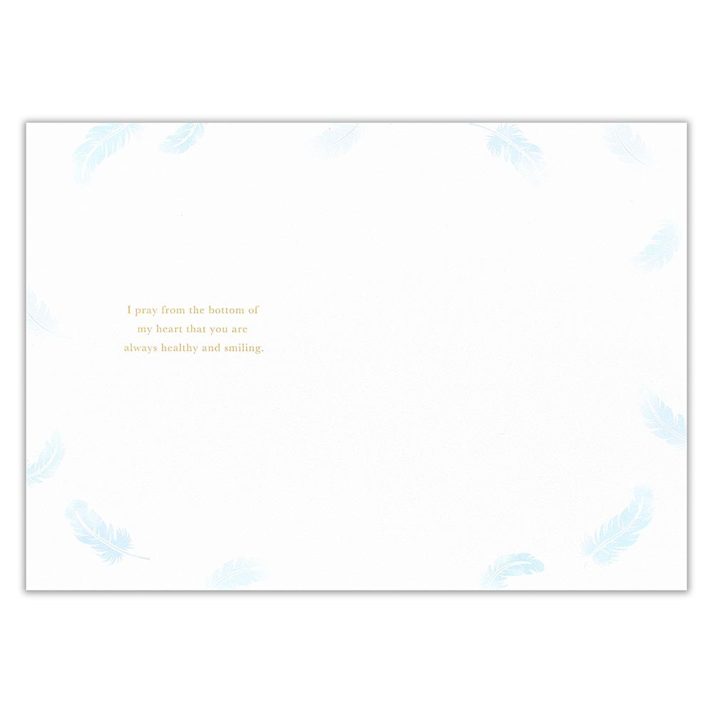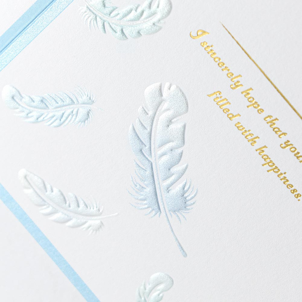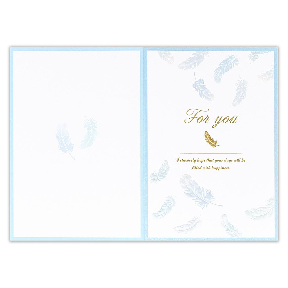 舞う羽根を水色系でまとめた、幅広くお使いいただけるデザインです。