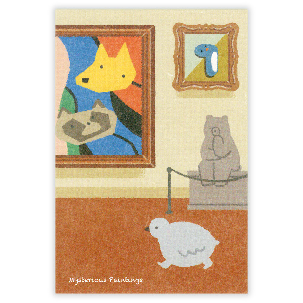 趣味の美術館めぐりを楽しむ動物たちを描いたポストカードです。