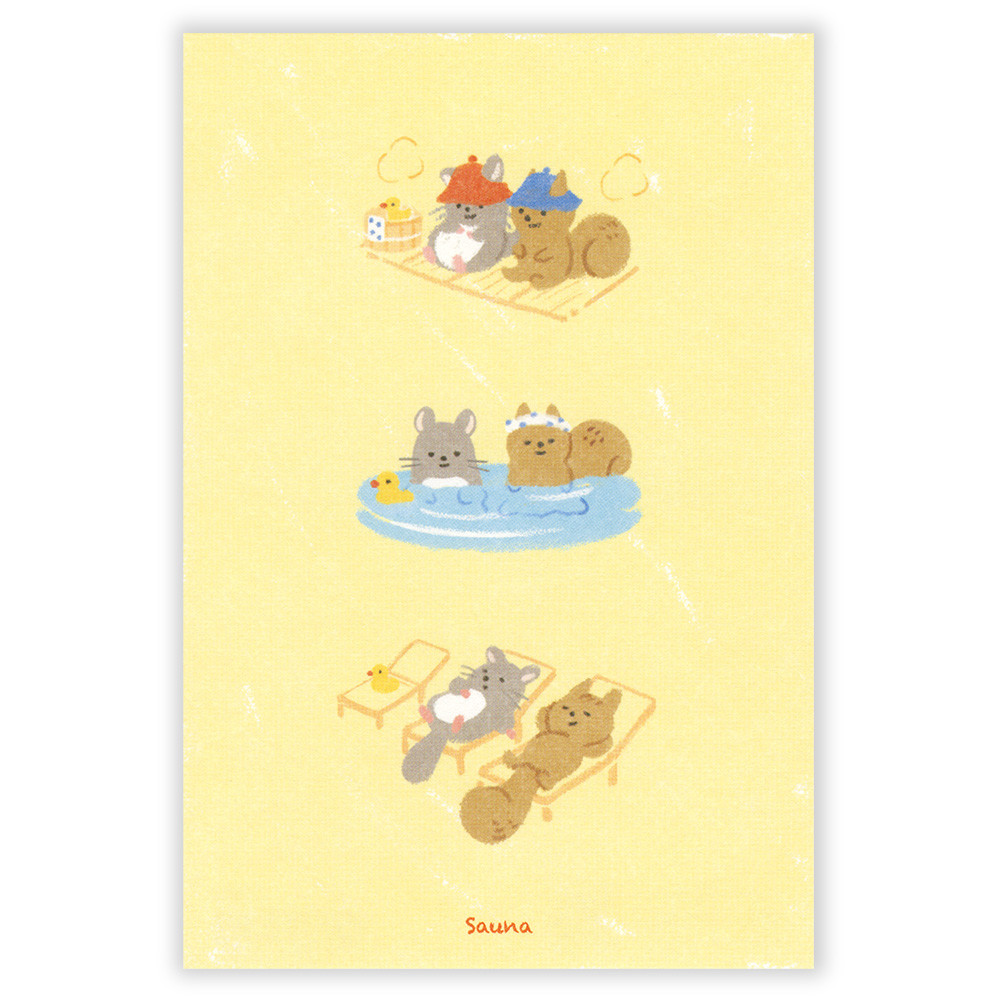 趣味のサウナを楽しむ動物たちを描いたポストカードです。