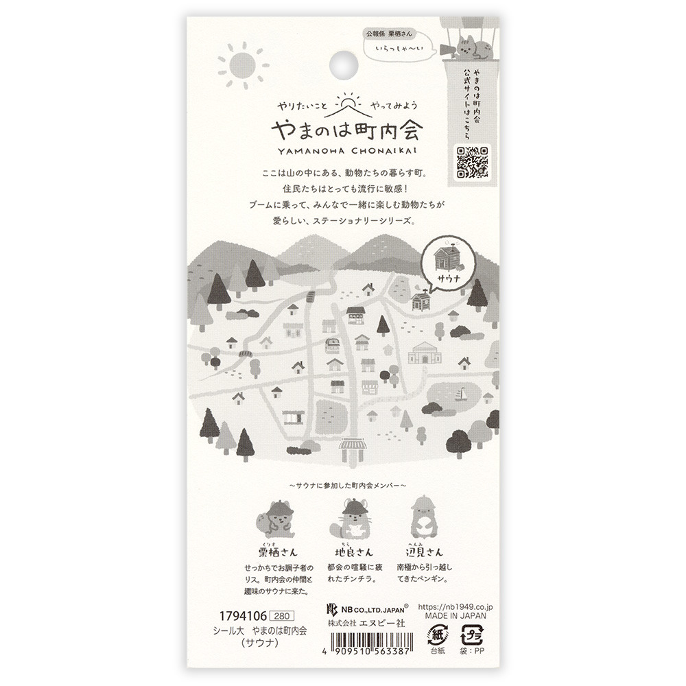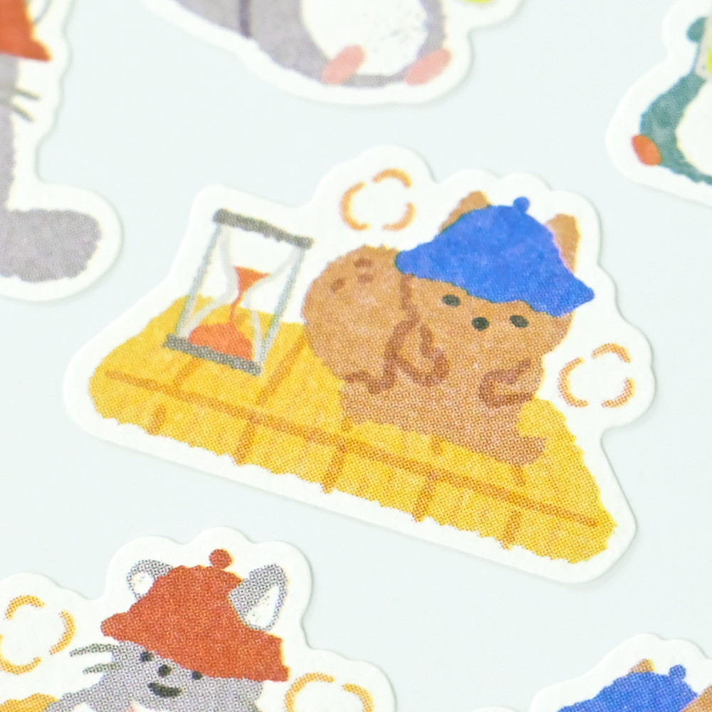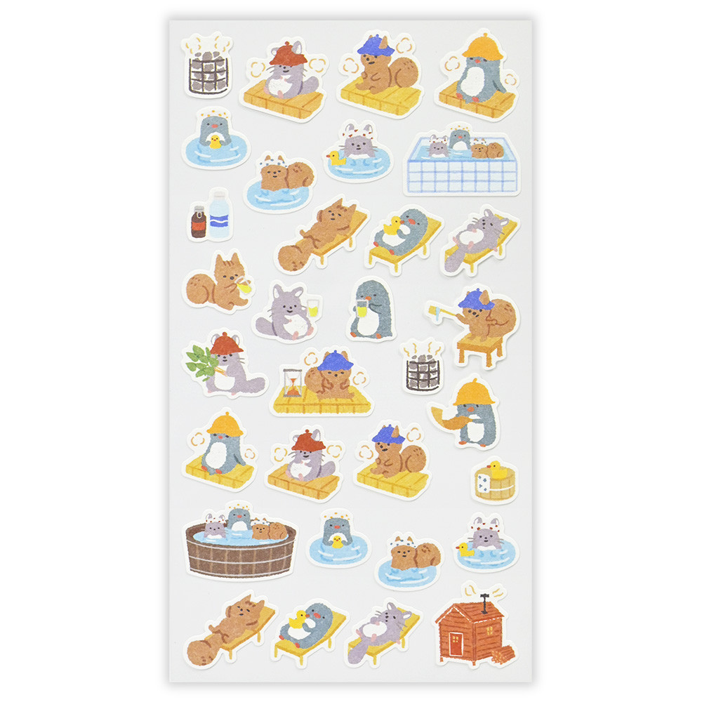 趣味のサウナを楽しむ動物たちを描いたシールです。