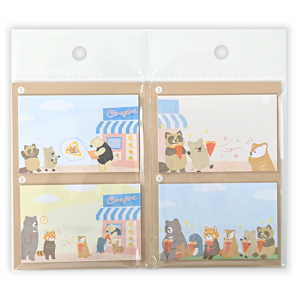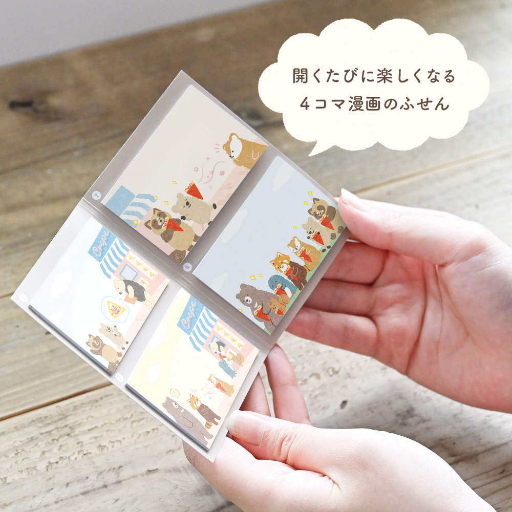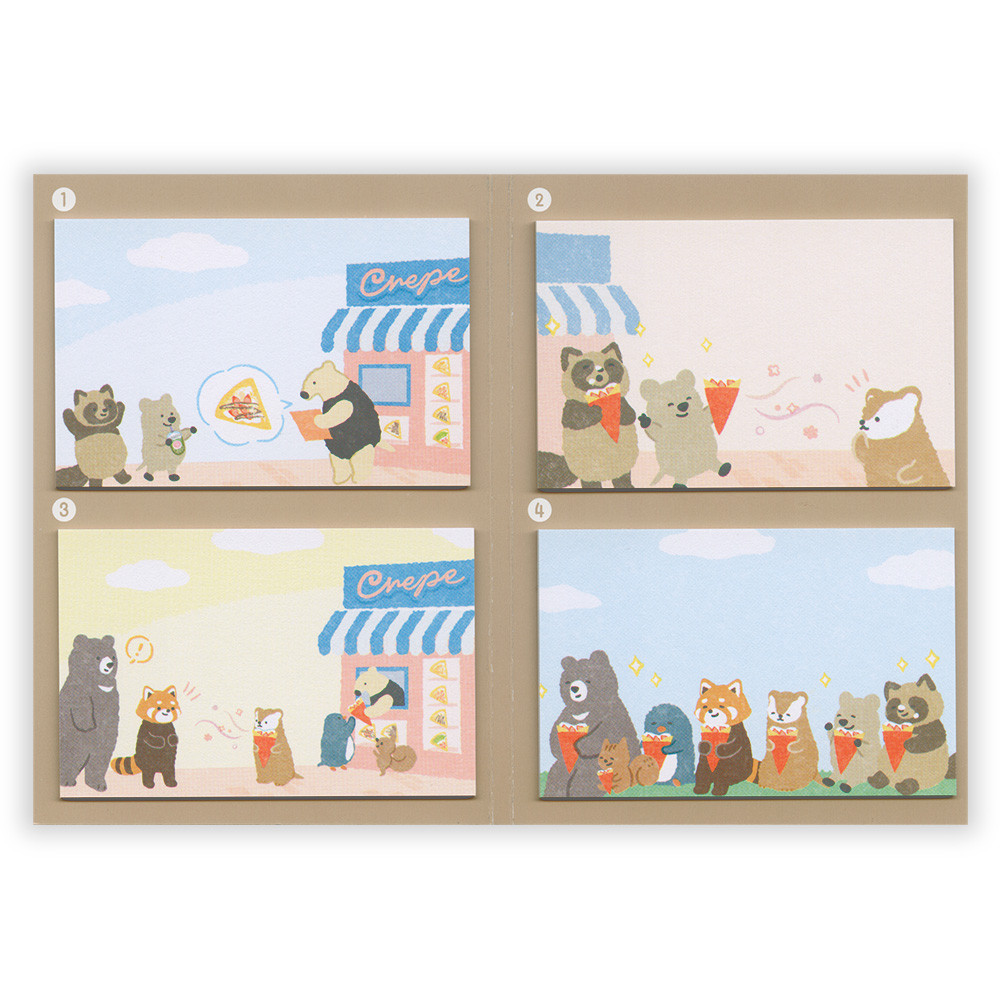 趣味の食べ歩きを楽しむ動物たちを描いた、開くたびに笑顔がこぼれるブック型の4コマ漫画ふせんです。