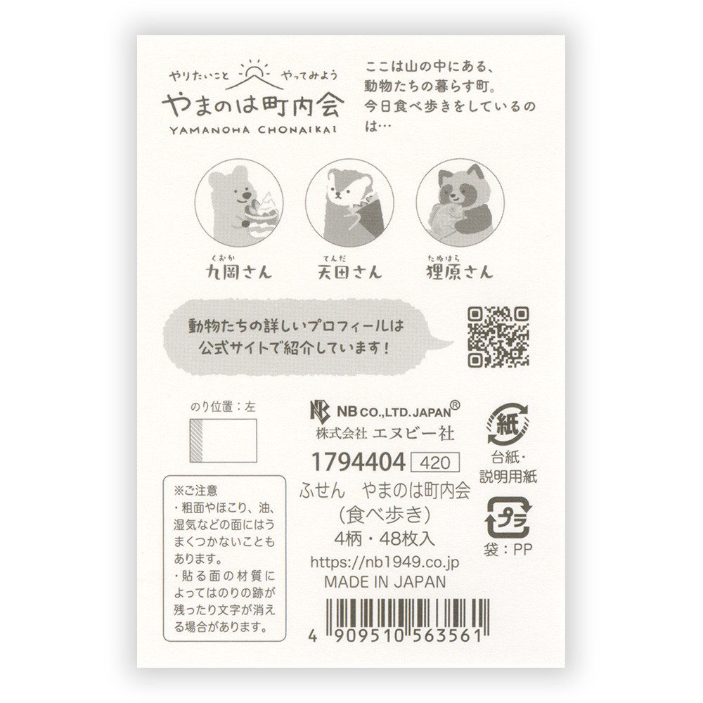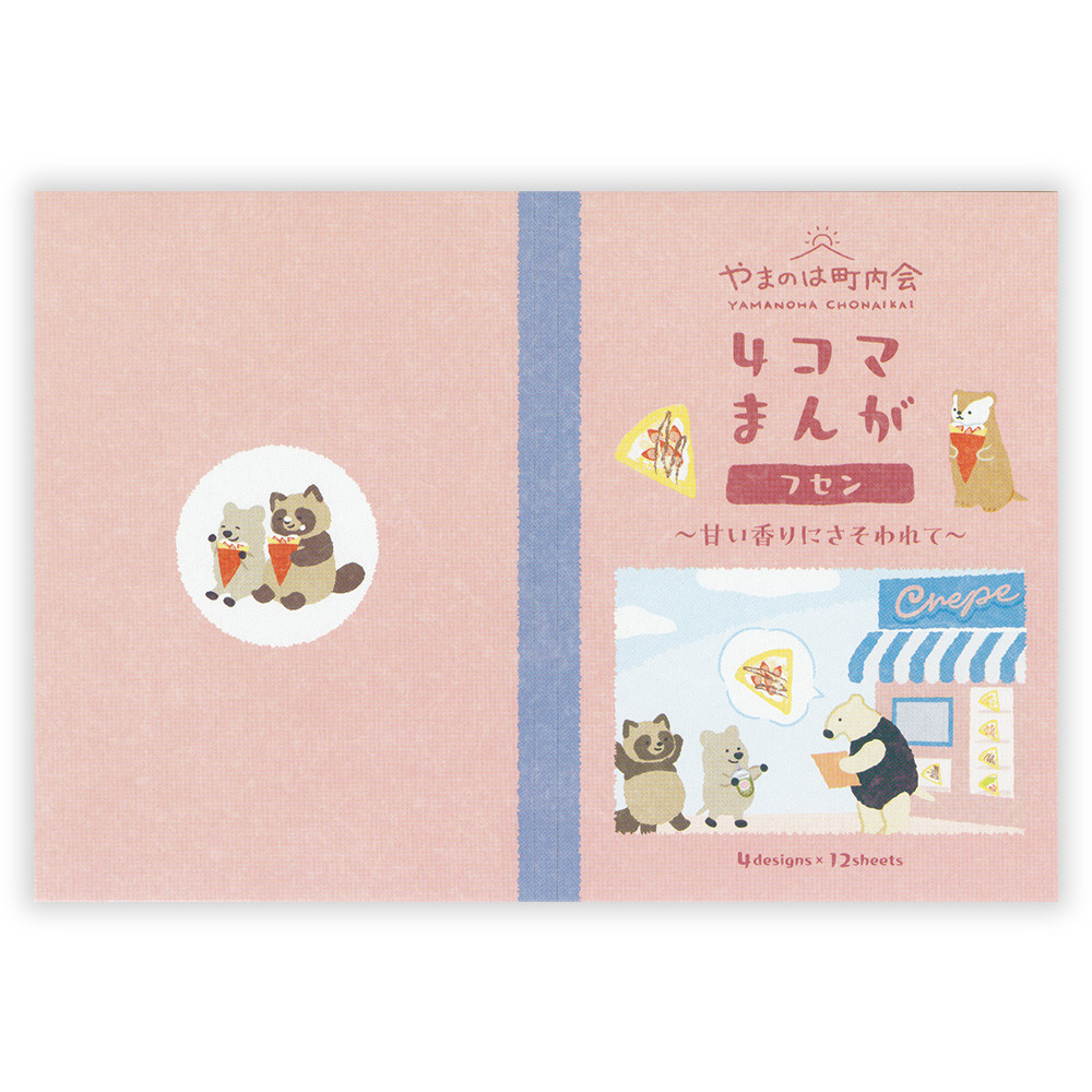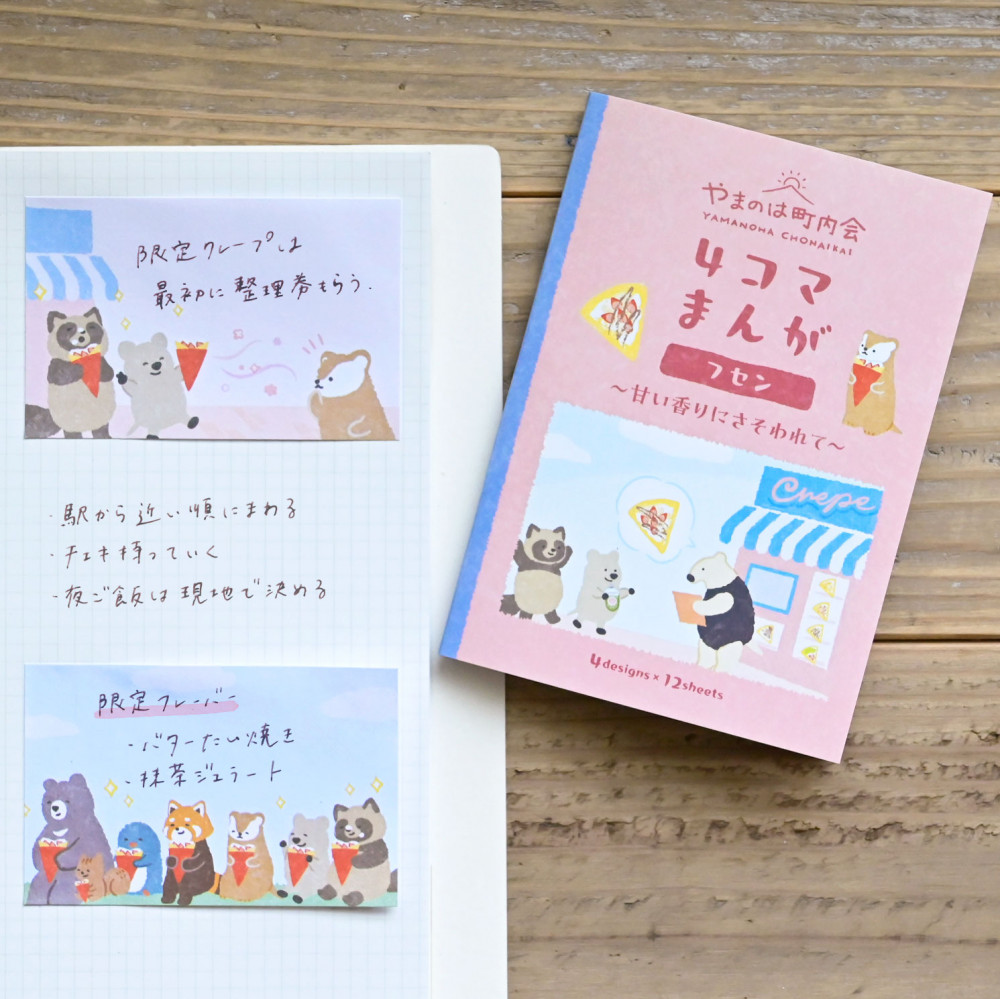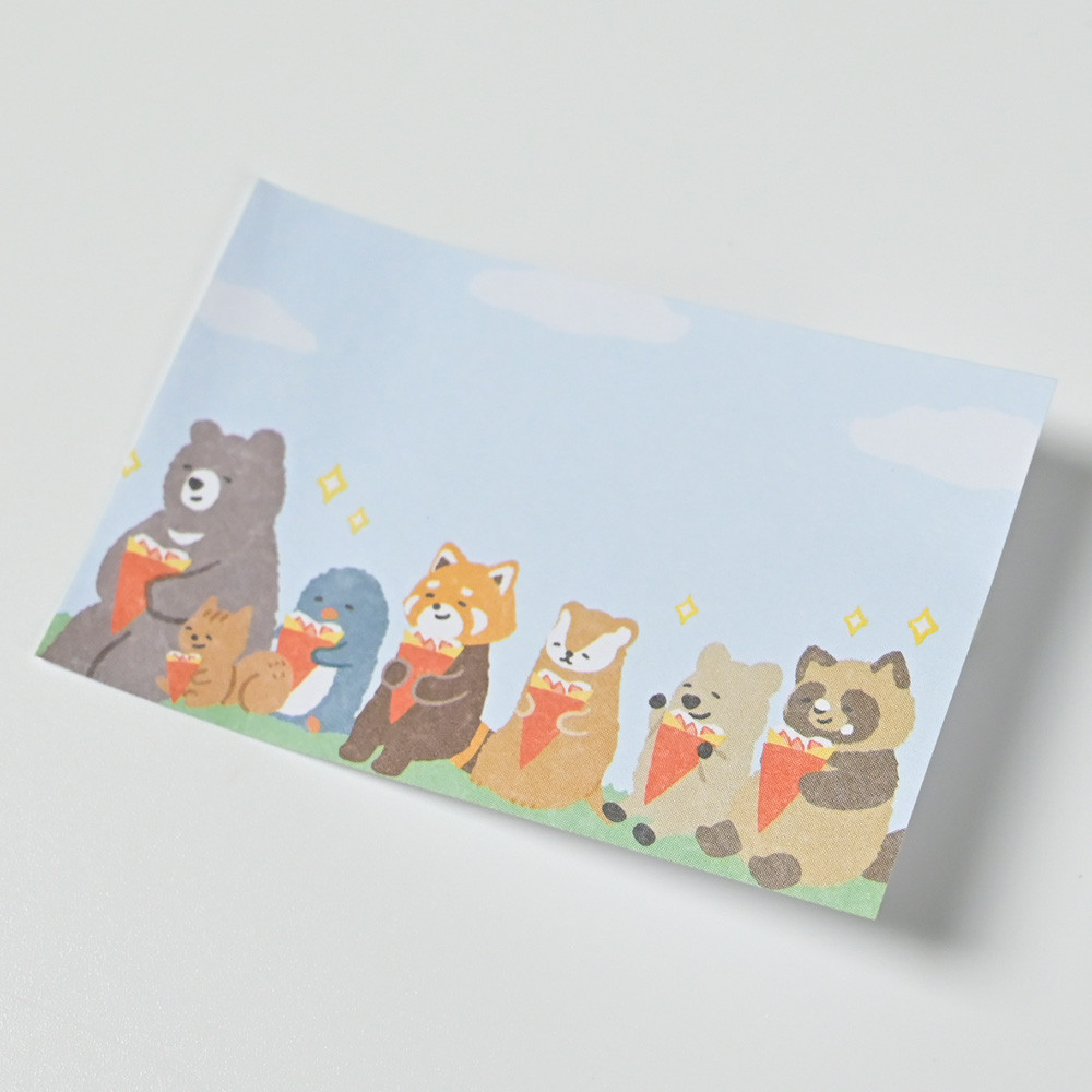 趣味の食べ歩きを楽しむ動物たちを描いた、開くたびに笑顔がこぼれるブック型の4コマ漫画ふせんです。