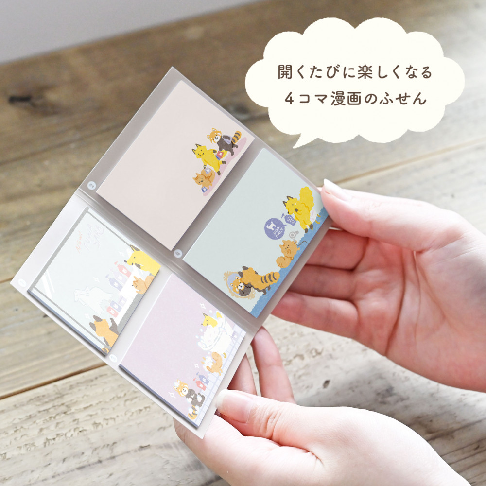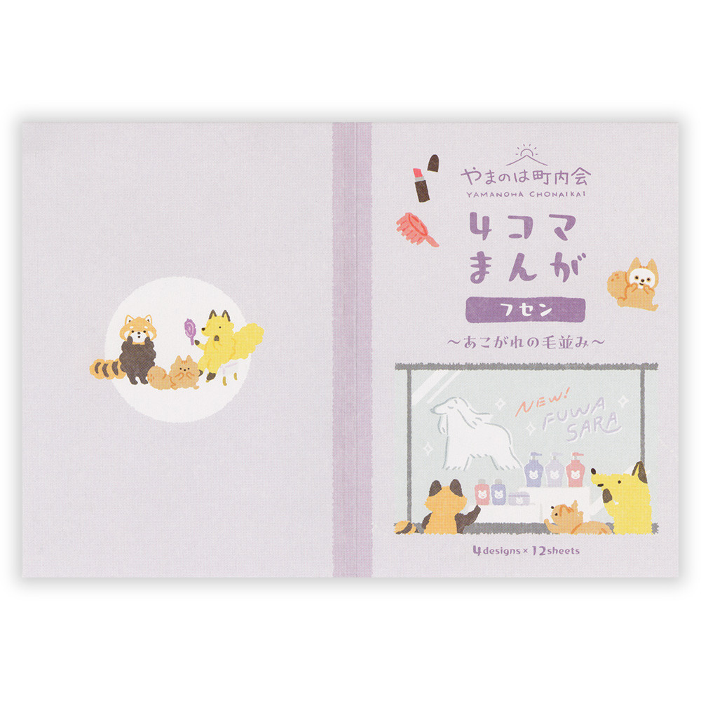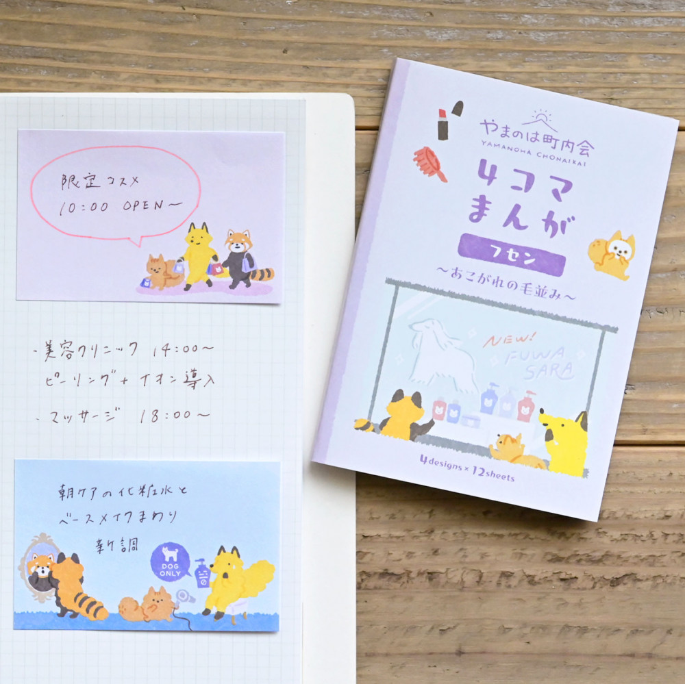 趣味の美容を楽しむ動物たちを描いた、開くたびに笑顔がこぼれるブック型の4コマ漫画ふせんです。