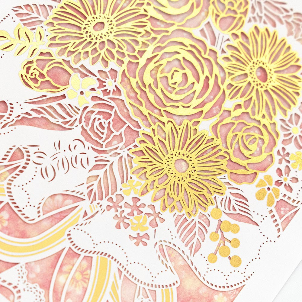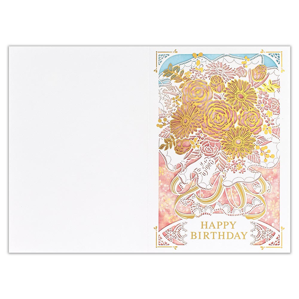 繊細なレーザーカットデザインの誕生日カードです。金箔押し加工がきらめきます。