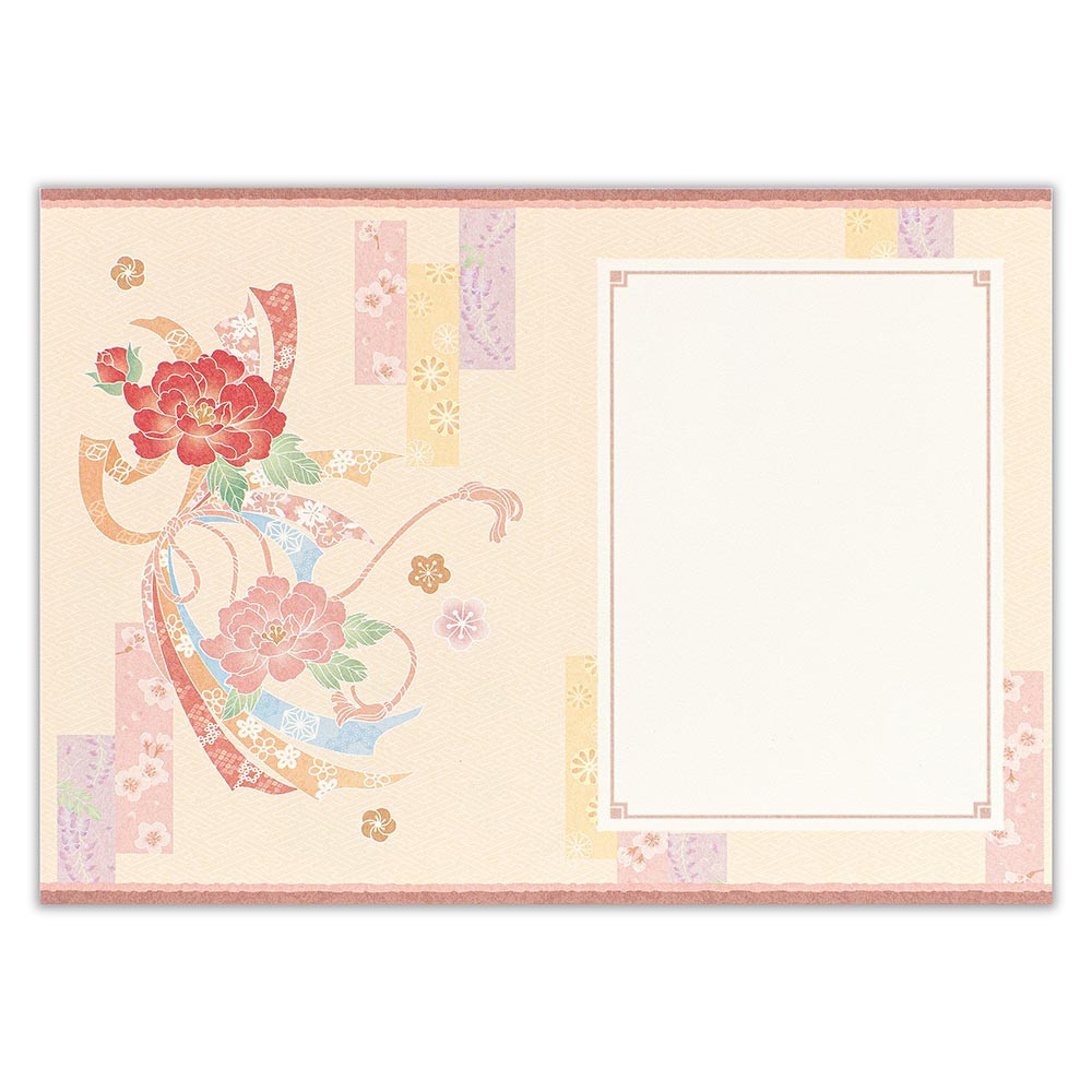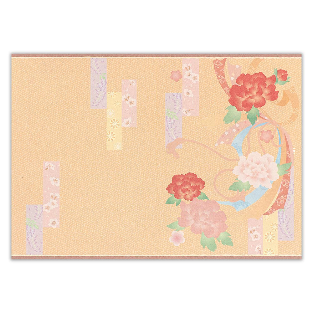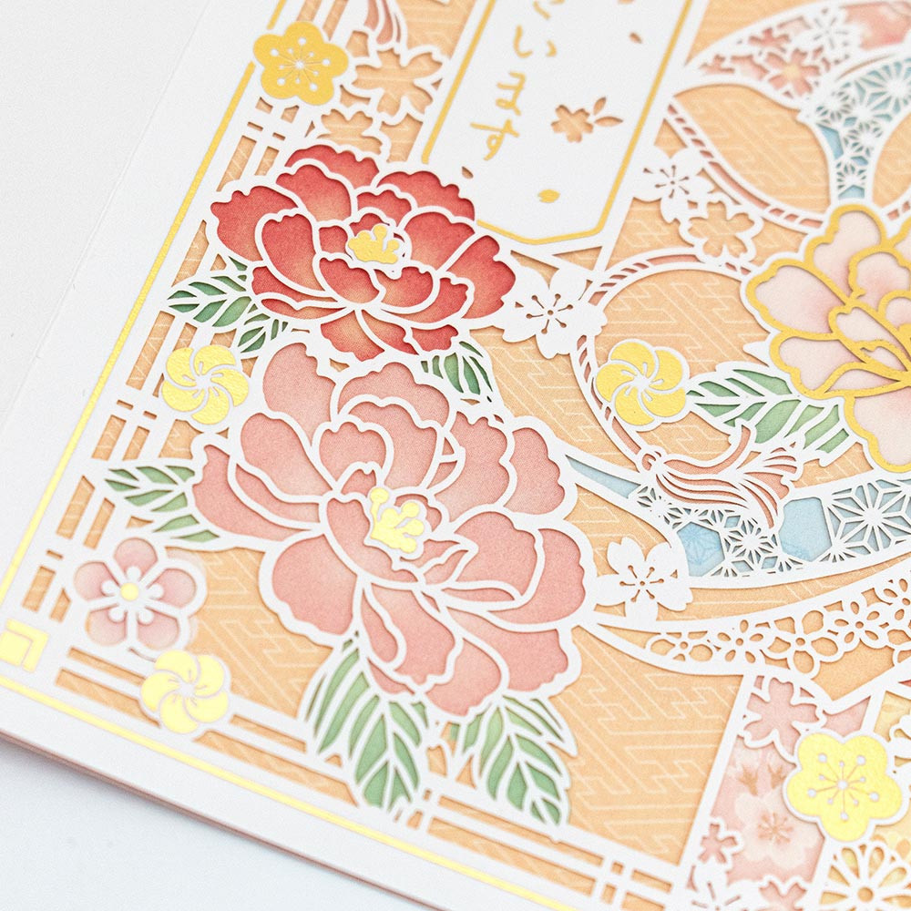 縁起のよい牡丹と束熨斗をレーザーカットでデザインし、背景に桜や藤、菊など四季の花々を描きました。