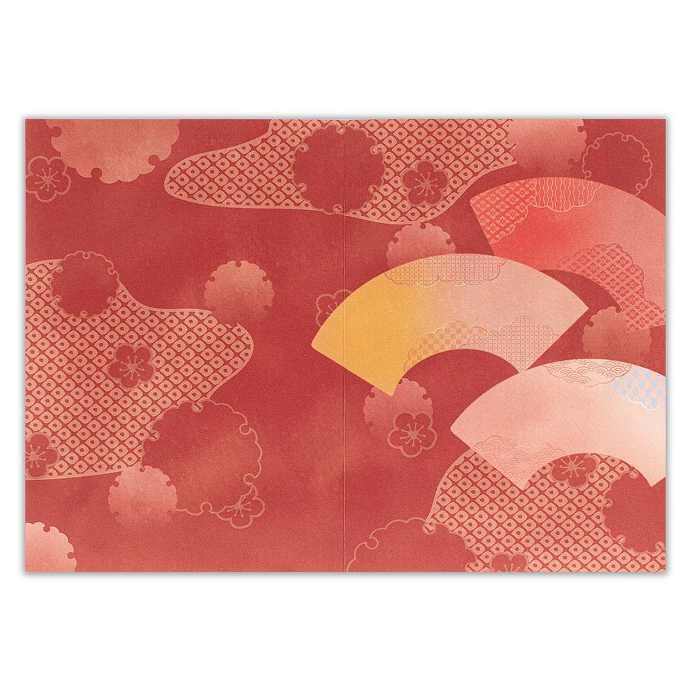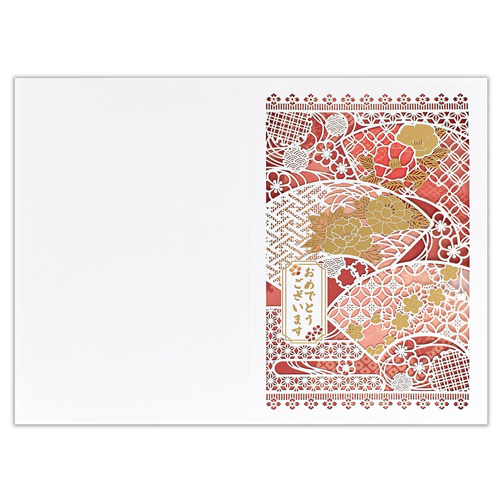 レーザーカットで繊細に表現した吉祥紋様と背景の赤がお祝いにぴったりなデザインです。