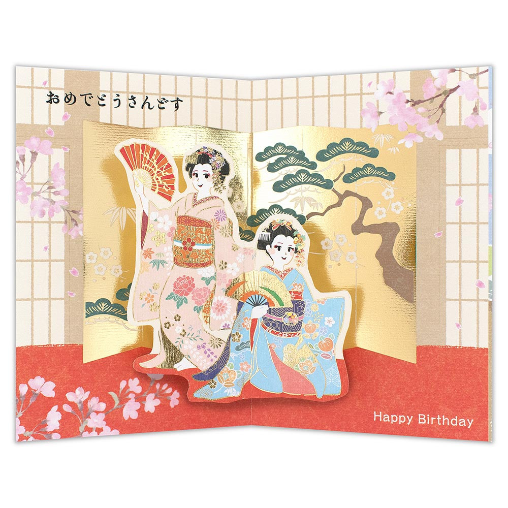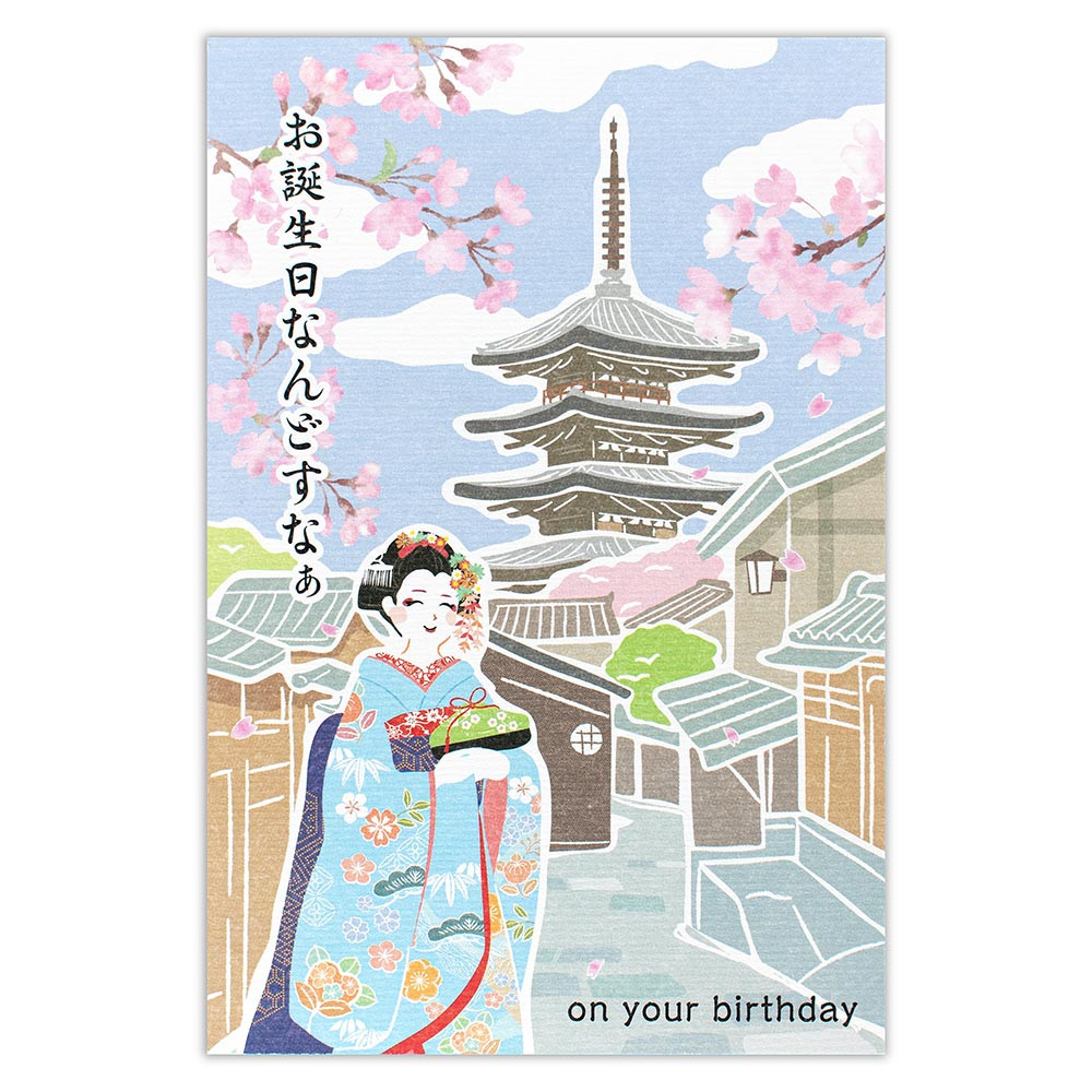 舞妓さんがお誕生日を祝ってくれるユーモアのあるデザインです。