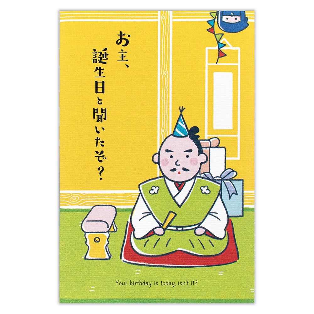 お城からお殿様がお誕生日を祝ってくれるユーモアのあるデザインです。カードを開くと大きなお城とお殿様が飛び出し、民たちも賑やかにお祝いしてくれます。