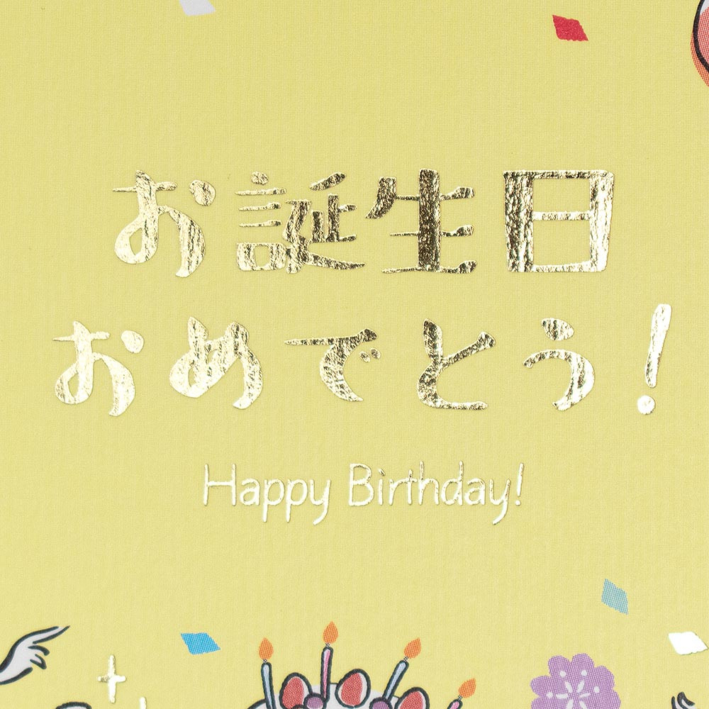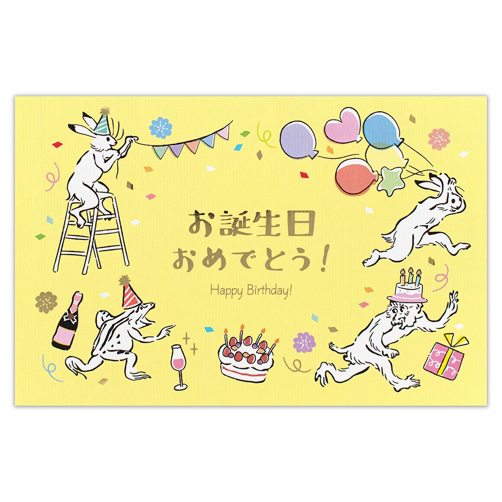 鳥獣戯画風の動物たちがサプライズ誕生日会をしているユーモアのあるデザインです。