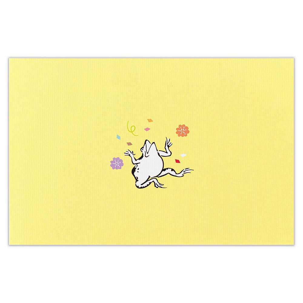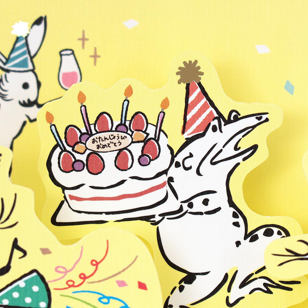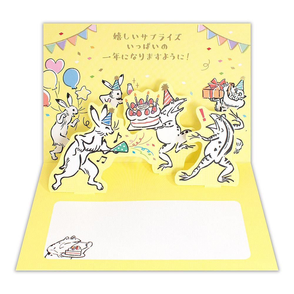 カードを開くとクラッカーでお祝いするうさぎや、ケーキとプレゼントに驚くカエルが飛び出します。