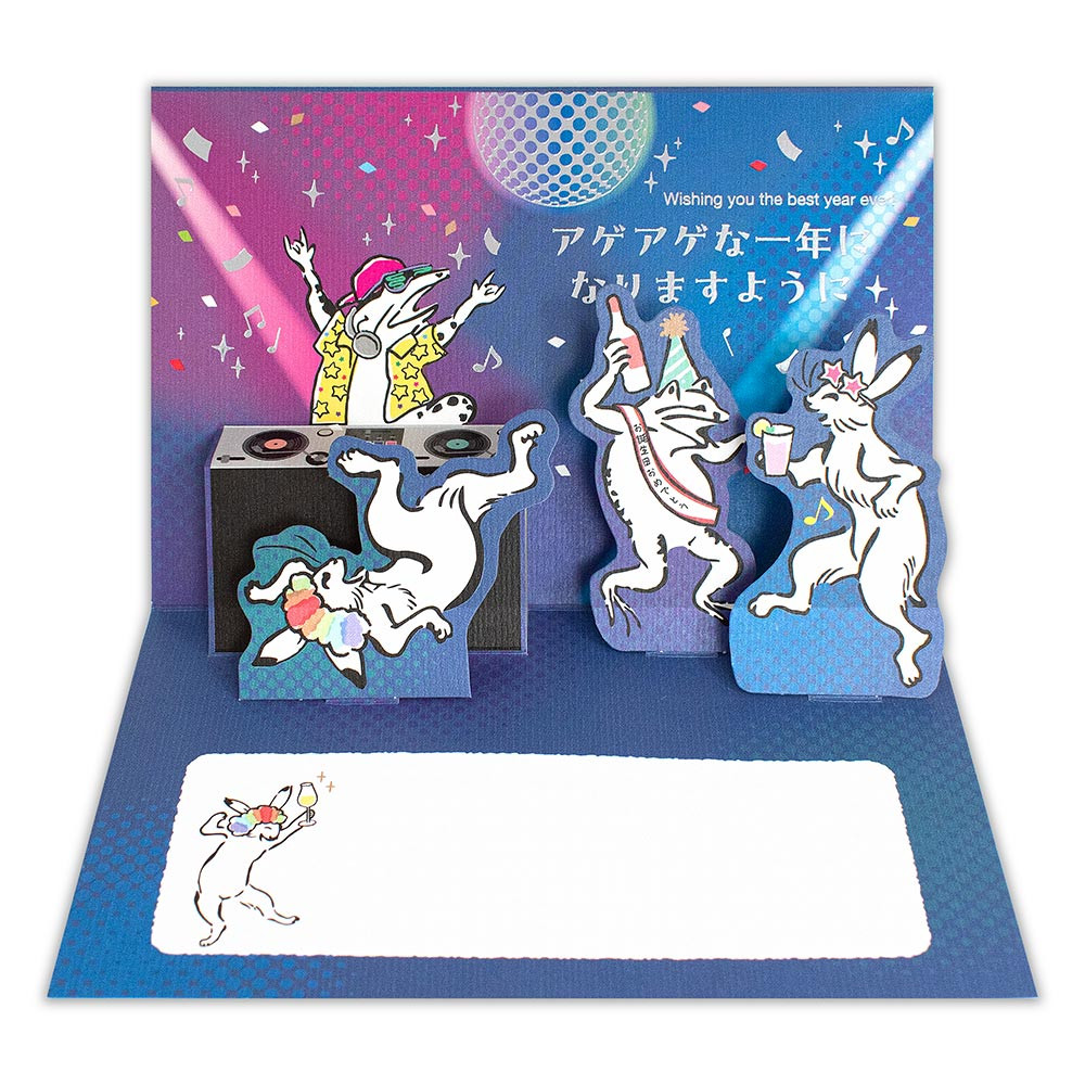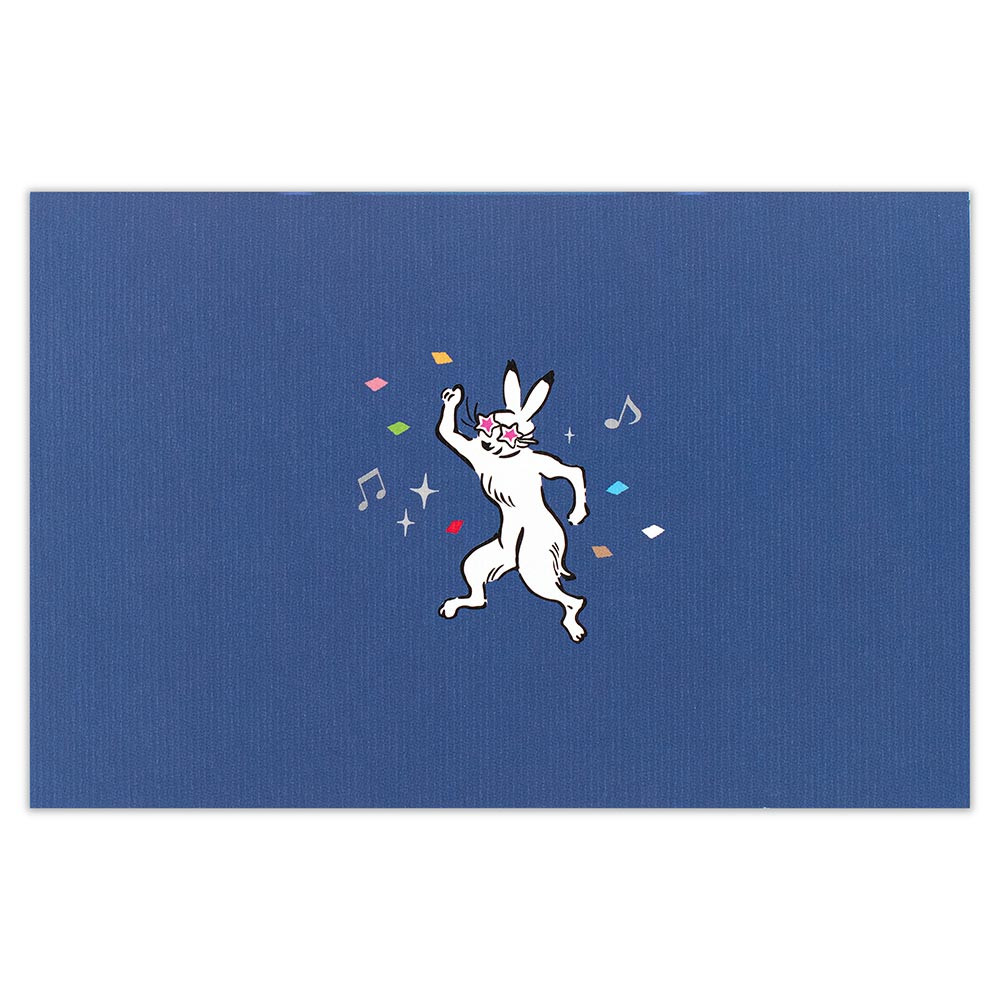 カードを開くとDJのカエルやダンスを楽しむうさぎたちが飛び出します。