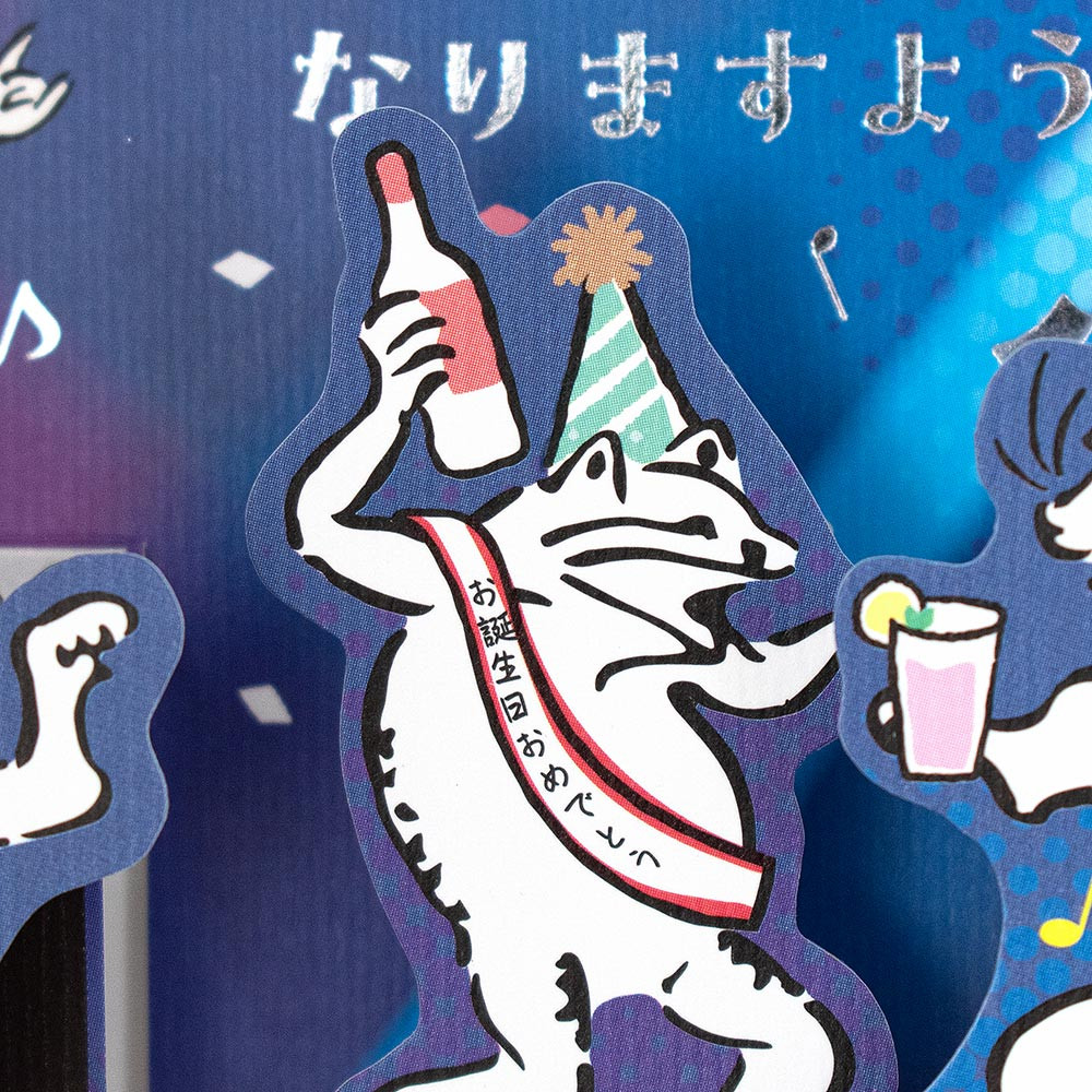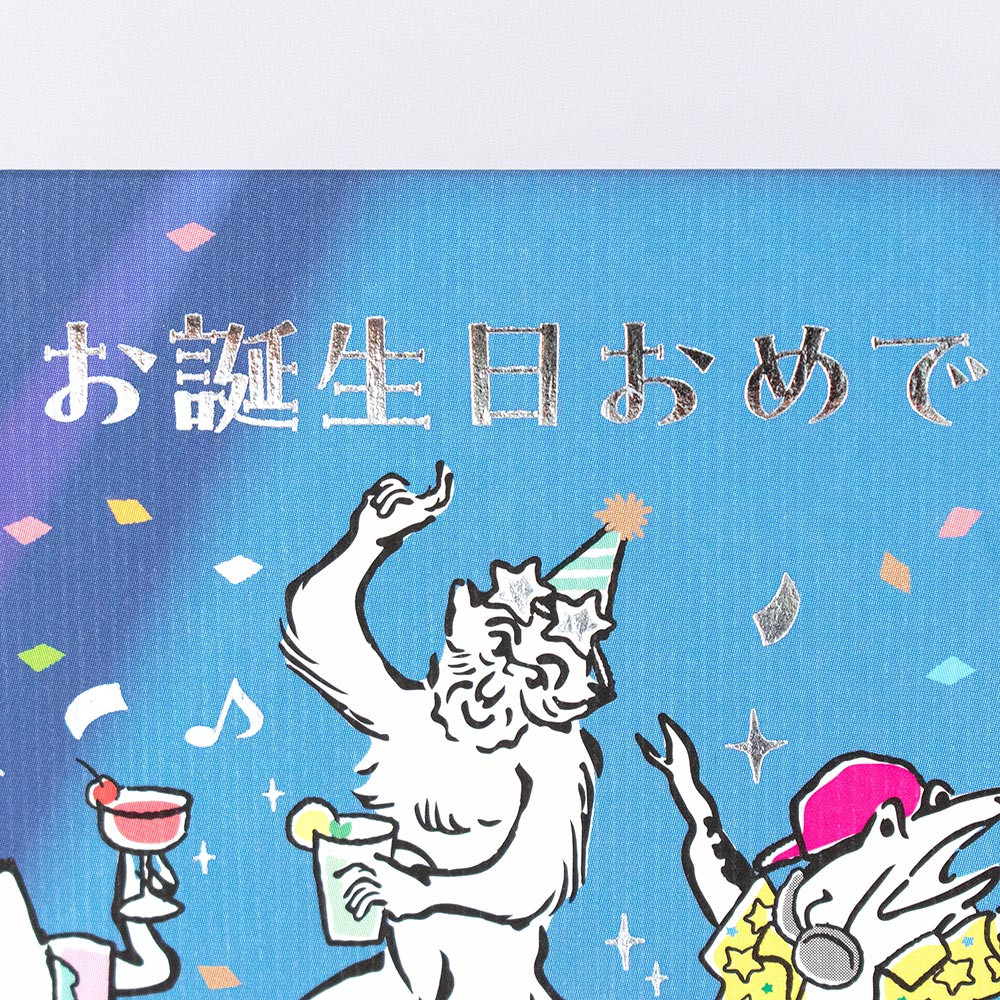 鳥獣戯画風の動物たちがクラブハウスで誕生日会をしているユーモアのあるデザインです。