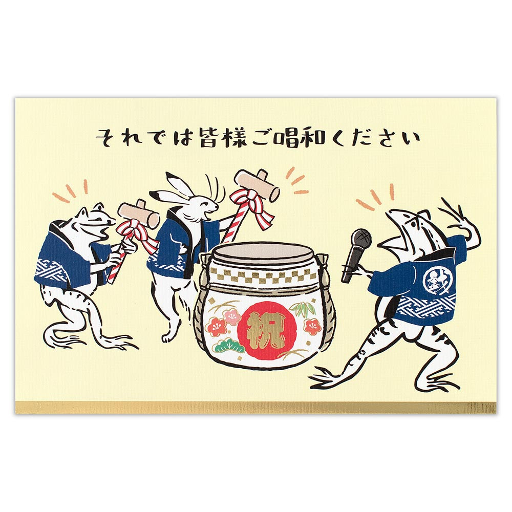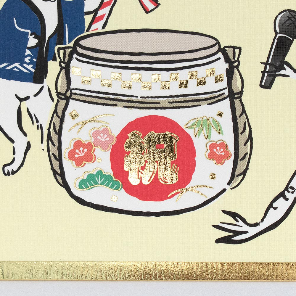 鳥獣戯画風の動物たちが祝賀会で鏡開きをしているユーモアのあるデザインです。