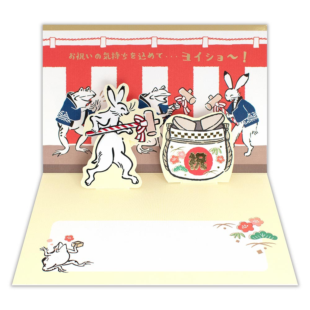 カードを開くと木槌で酒樽をつくうさぎが飛び出します。