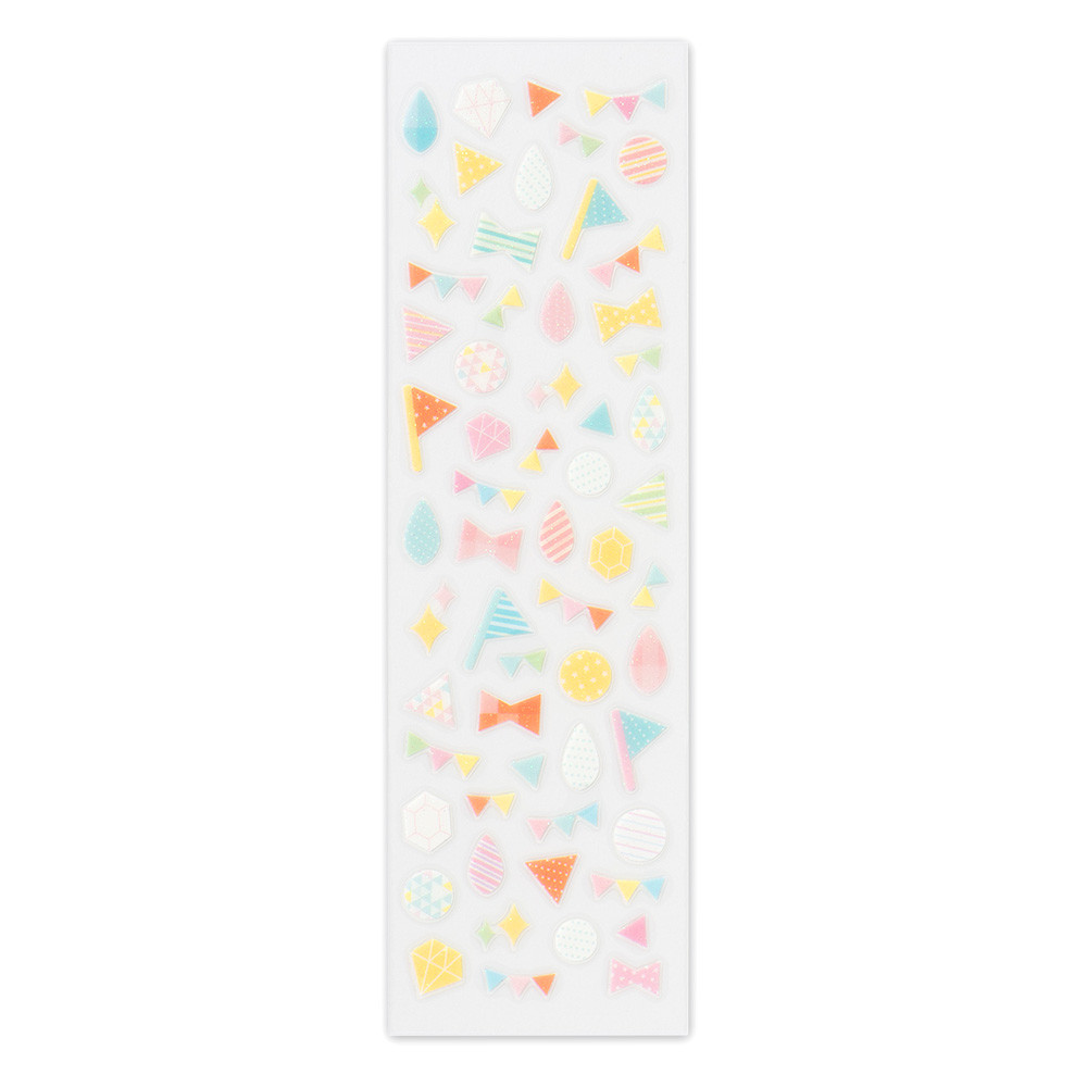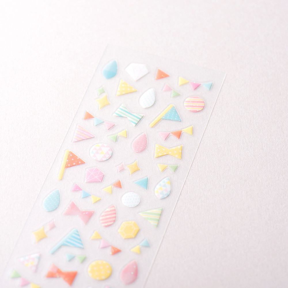 リボンや旗などのデコレーションに最適なモチーフをカラフルに描いたシールです。
